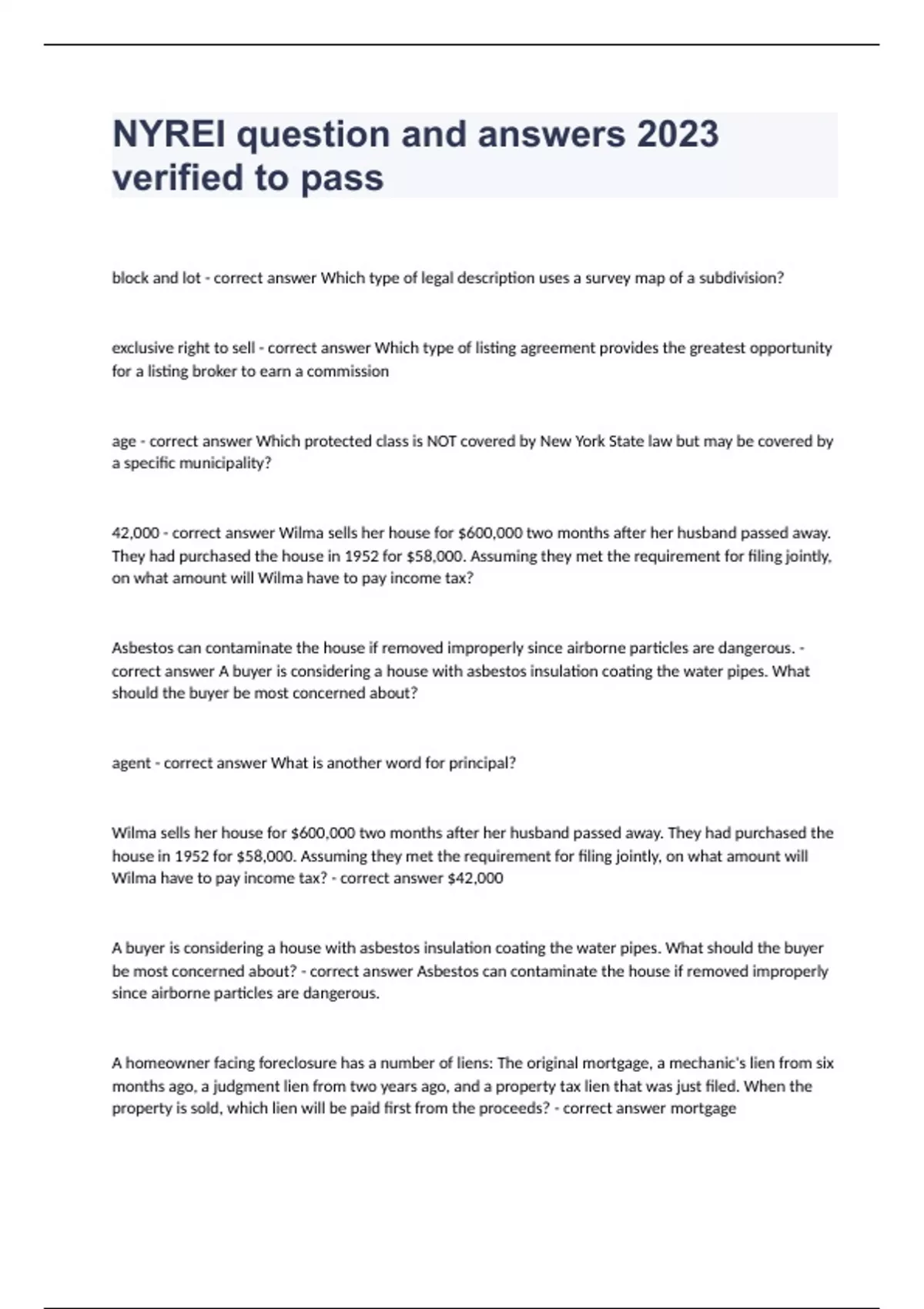 NYREI question and answers 2023 verified to passblock and lot - correct answer Which type of legal description uses a survey map of a subdivision? exclusive right to sell - correct answer Which type of listing agreement provides the greatest opportunity for a listing broker to earn a commission age - correct answer Which protected class is NOT covered by New York State law but may be covered by a specific municipality? 42,000 - correct answer Wilma sells her house for $600,000 two months after her husband passed away. They had purchased the house in 1952 for $58,000. Assuming they met the requirement for filing jointly, on what amount will Wilma have to pay income tax? Asbestos can contaminate the house if removed improperly since airborne particles are dangerous. - correct answer A buyer is considering a house with asbestos insulation coating the water pipes. What should the buyer be most concerned about? agent - correct answer What is another word for principal? Wilma sells her house for $600,000 two months after her husband passed away. They had purchased the house in 1952 for $58,000. Assuming they met the requirement for filing jointly, on what amount will Wilma have to pay income tax? - correct answer $42,000 A buyer is considering a house with asbestos insulation coating the water pipes. What should the buyer be most concerned about? - correct answer Asbestos can contaminate the house if removed improperly since airborne particles are dangerous. A homeowner facing foreclosure has a number of liens: The original mortgage, a mechanic's lien from six months ago, a judgment lien from two years ago, and a property tax lien that was just filed. When the property is sold, which lien will be paid first from the proceeds? - correct answer mortgage