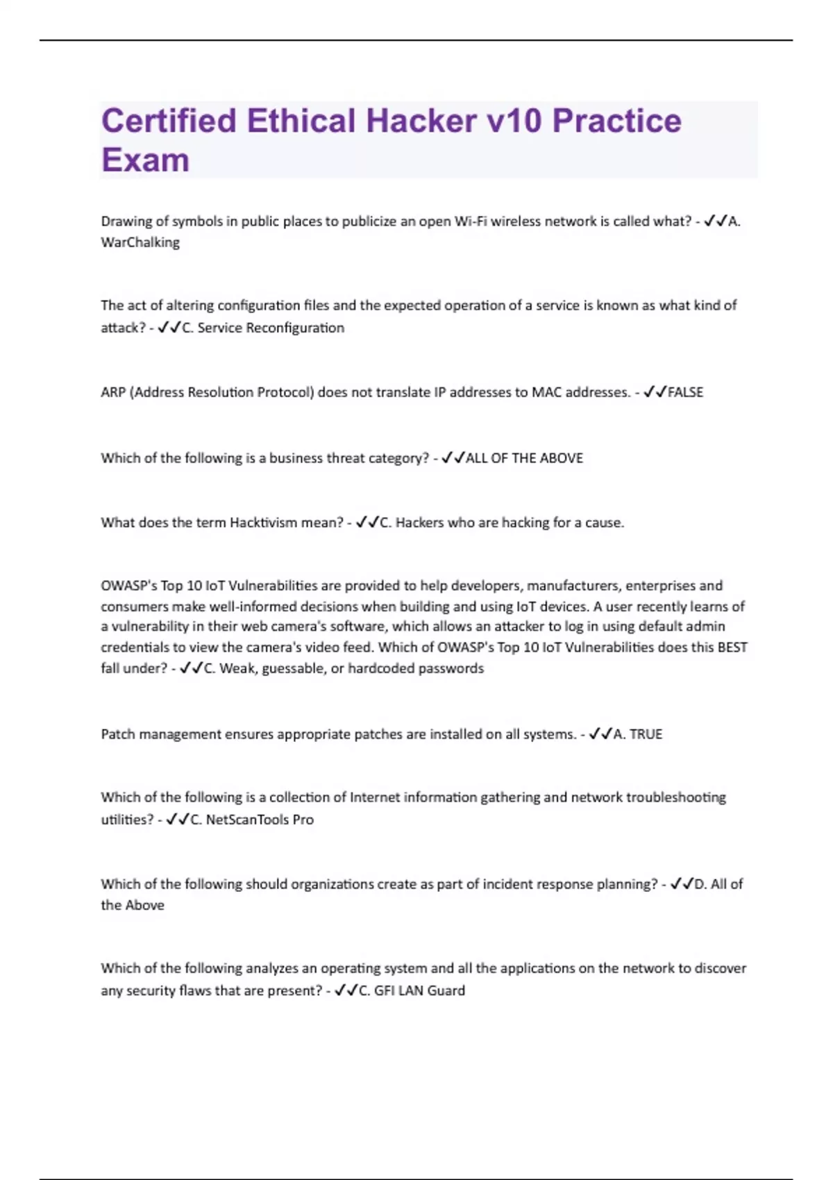 Drawing of symbols in public places to publicize an open Wi-Fi wireless network is called what? - A. WarChalking The act of altering configuration files and the expected operation of a service is known as what kind of attack? - C. Service Reconfiguration ARP (Address Resolution Protocol) does not translate IP addresses to MAC addresses. - FALSE Which of the following is a business threat category? - ALL OF THE ABOVE What does the term Hacktivism mean? - C. Hackers who are hacking for a cause. OWASP's Top 10 IoT Vulnerabilities are provided to help developers, manufacturers, enterprises and consumers make well-informed decisions when building and using IoT devices. A user recently learns of a vulnerability in their web camera's software, which allows an attacker to log in using default admin credentials to view the camera's video feed. Which of OWASP's Top 10 IoT Vulnerabilities does this BEST fall under? - C. Weak, guessable, or hardcoded passwords Patch management ensures appropriate patches are installed on all systems. - A. TRUE Which of the following is a collection of Internet information gathering and network troubleshooting utilities? - C. NetScanTools Pro Which of the following should organizations create as part of incident response planning? - D. All of the Above Which of the following analyzes an operating system and all the applications on the network to discover any security flaws that are present? - C. GFI LAN Guard
