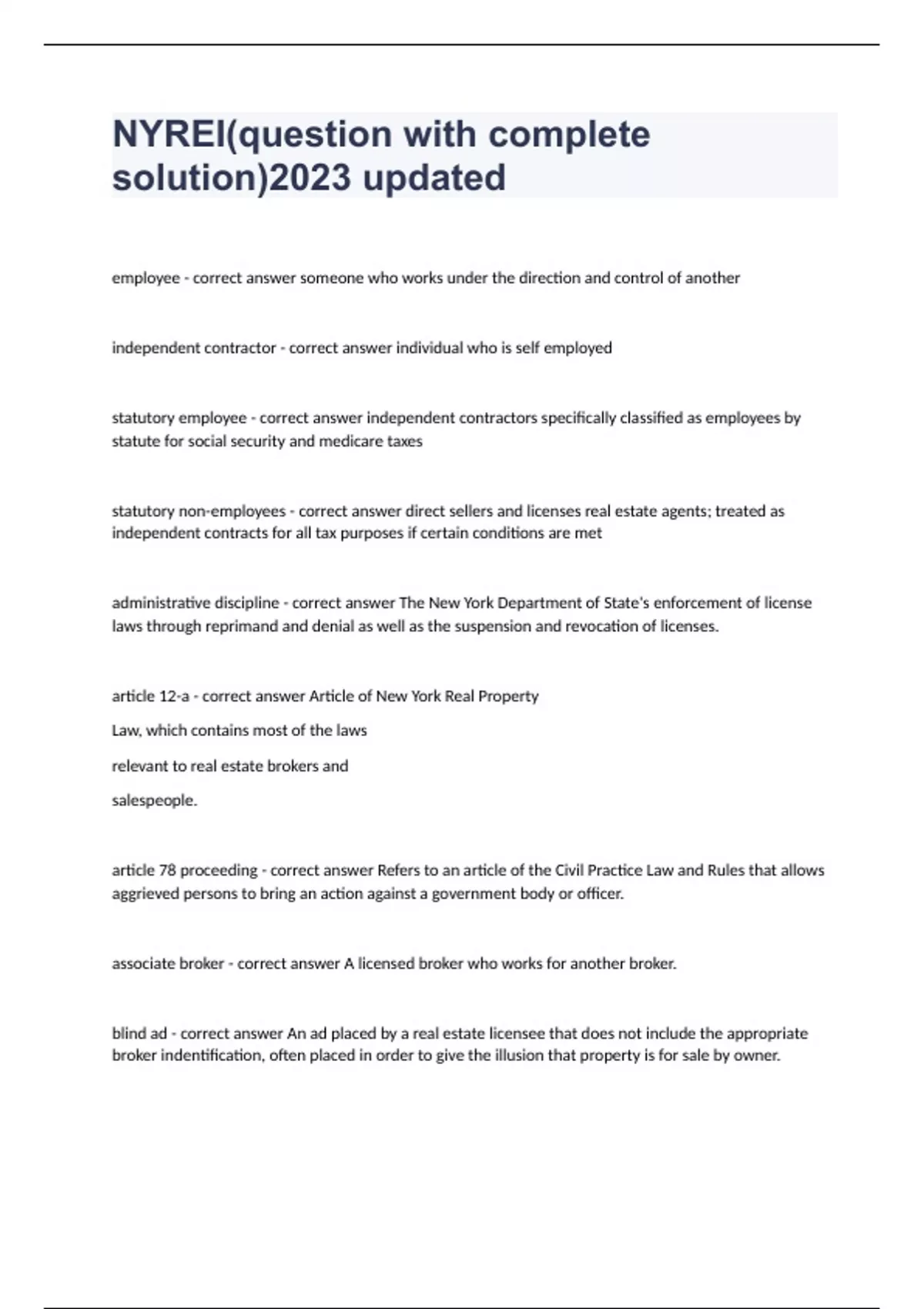 NYREI(question with complete solution)2023 updatedemployee - correct answer someone who works under the direction and control of another independent contractor - correct answer individual who is self employed statutory employee - correct answer independent contractors specifically classified as employees by statute for social security and medicare taxes statutory non-employees - correct answer direct sellers and licenses real estate agents; treated as independent contracts for all tax purposes if certain conditions are met administrative discipline - correct answer The New York Department of State's enforcement of license laws through reprimand and denial as well as the suspension and revocation of licenses. article 12-a - correct answer Article of New York Real Property Law, which contains most of the laws relevant to real estate brokers and salespeople. article 78 proceeding - correct answer Refers to an article of the Civil Practice Law and Rules that allows aggrieved persons to bring an action against a government body or officer. associate broker - correct answer A licensed broker who works for another broker. blind ad - correct answer An ad placed by a real estate licensee that does not include the appropriate broker indentification, often placed in order to give the illusion that property is for sale by owner.