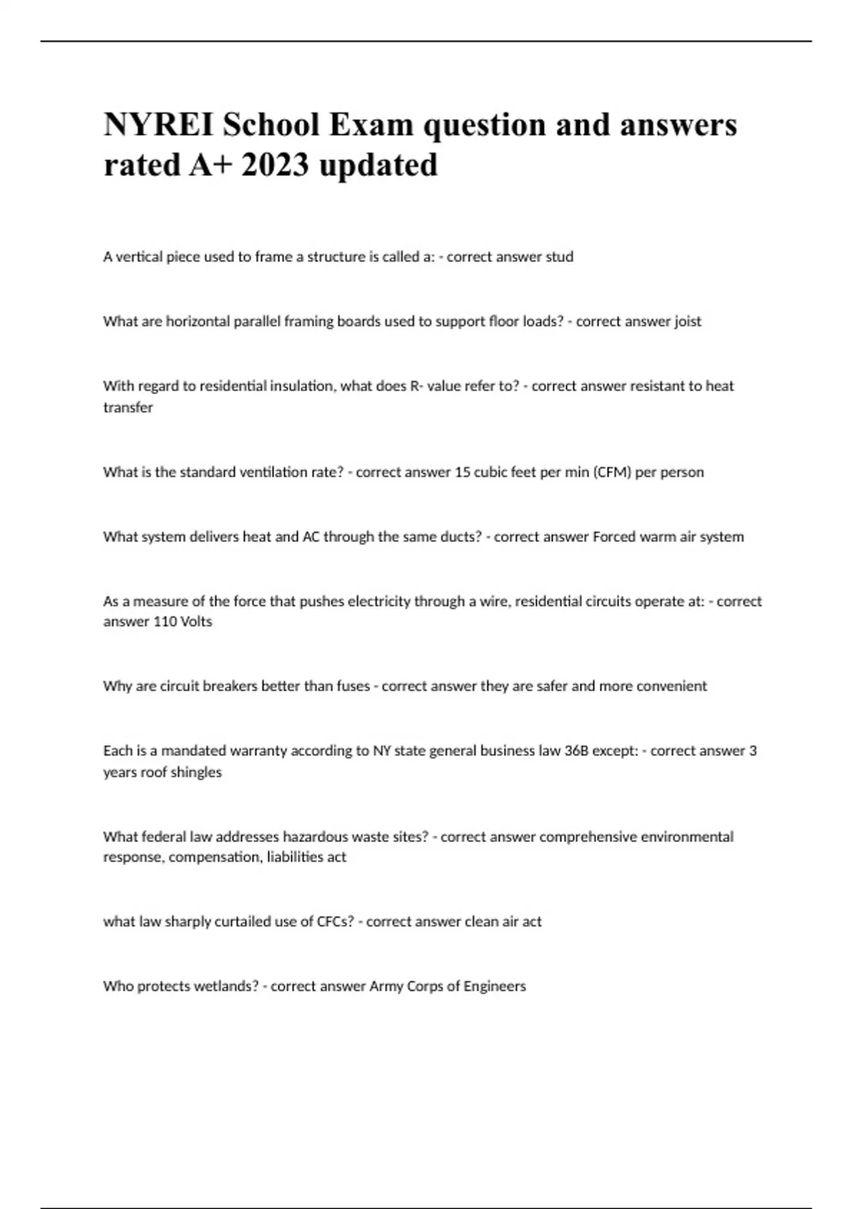 NYREI School Exam question and answers rated A+ 2023 updatedA vertical piece used to frame a structure is called a: - correct answer stud What are horizontal parallel framing boards used to support floor loads? - correct answer joist With regard to residential insulation, what does R- value refer to? - correct answer resistant to heat transfer What is the standard ventilation rate? - correct answer 15 cubic feet per min (CFM) per person What system delivers heat and AC through the same ducts? - correct answer Forced warm air system As a measure of the force that pushes electricity through a wire, residential circuits operate at: - correct answer 110 Volts Why are circuit breakers better than fuses - correct answer they are safer and more convenient Each is a mandated warranty according to NY state general business law 36B except: - correct answer 3 years roof shingles What federal law addresses hazardous waste sites? - correct answer comprehensive environmental response, compensation, liabilities act what law sharply curtailed use of CFCs? - correct answer clean air act Who protects wetlands? - correct answer Army Corps of Engineers