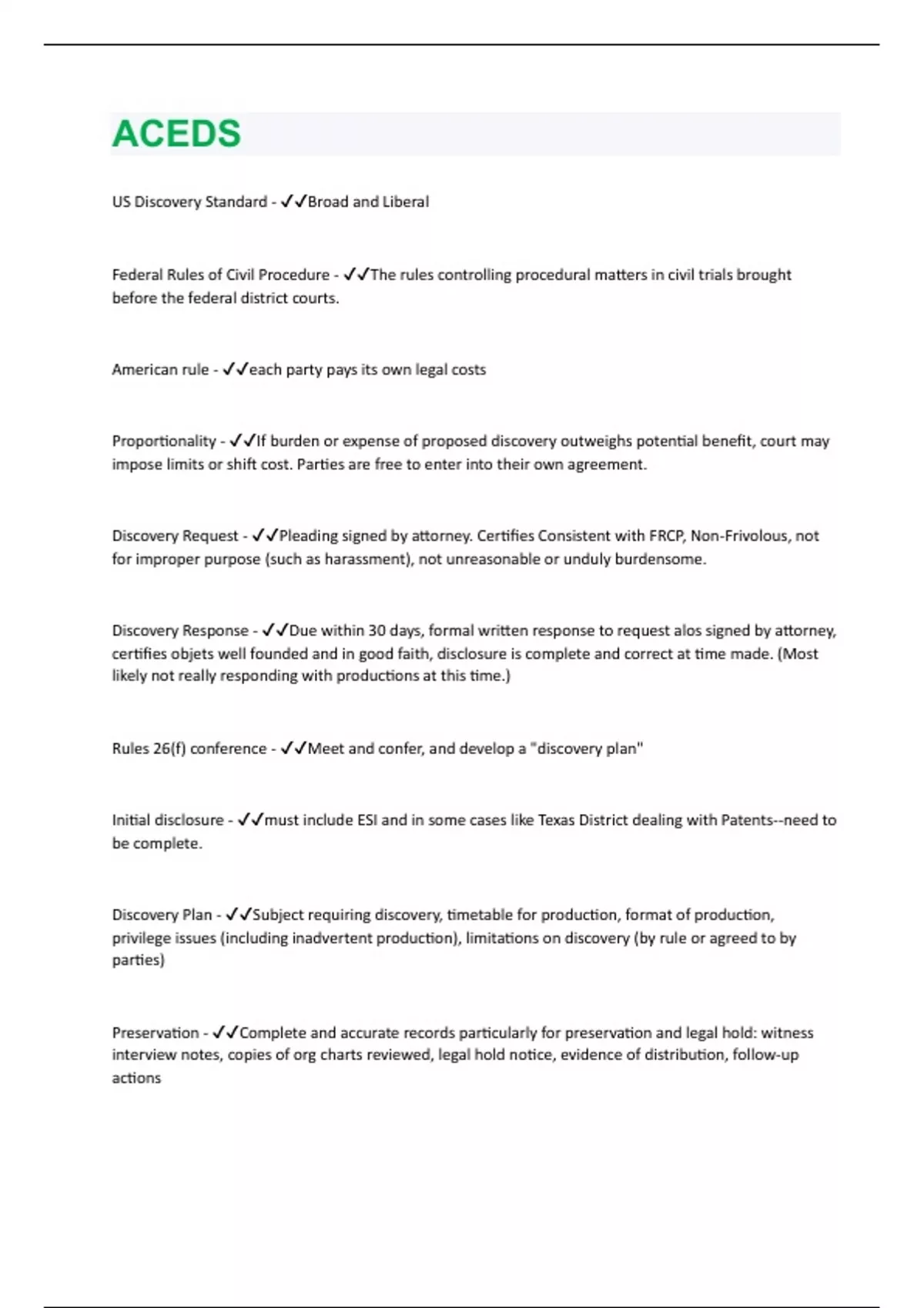 ACEDS US Discovery Standard - ✔✔Broad and Liberal Federal Rules of Civil Procedure - ✔✔The rules controlling procedural matters in civil trials brought before the federal district courts. American rule - ✔✔each party pays its own legal costs Proportionality - ✔✔If burden or expense of proposed discovery outweighs potential benefit, court may impose limits or shift cost. Parties are free to enter into their own agreement. Discovery Request - ✔✔Pleading signed by attorney. Certifies Consistent with FRCP , Non -Frivolous, not for improper purpose (such as harassment), not unreasonable or unduly burdensome. Discovery Response - ✔✔Due within 30 days, formal written response to request alos signed by attorney, certifies objets well founded and in good faith, disclosure is complete and correct at time made. (Most likely not really responding with productions at this time.) Rules 26(f) conference - ✔✔Meet and confer, and develop a "discovery plan" Initial disclosure - ✔✔must include ESI and in some cases like Texas Dist rict dealing with Patents --need to be complete. Discovery Plan - ✔✔Subject requiring discovery, timetable for production, format of production, privilege issues (including inadvertent production), limitations on discovery (by rule or agreed to by parties) Preservation - ✔✔Complete and accurate records particularly for preservation and legal hold: witness interview notes, copies of org charts reviewed, legal hold notice, evidence of distribution, follow -up actions