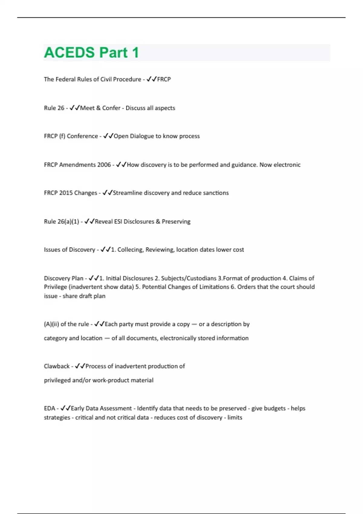 The Federal Rules of Civil Procedure - FRCP Rule 26 - Meet & Confer - Discuss all aspects FRCP (f) Conference - Open Dialogue to know process FRCP Amendments 2006 - How discovery is to be performed and guidance. Now electronic FRCP 2015 Changes - Streamline discovery and reduce sanctions Rule 26(a)(1) - Reveal ESI Disclosures & Preserving Issues of Discovery - 1. Collecing, Reviewing, location dates lower cost Discovery Plan - 1. Initial Disclosures 2. Subjects/Custodians 3.Format of production 4. Claims of Privilege (inadvertent show data) 5. Potential Changes of Limitations 6. Orders that the court should issue - share draft plan (A)(ii) of the rule - Each party must provide a copy — or a description by category and location — of all documents, electronically stored information Clawback - Process of inadvertent production of privileged and/or work-product material EDA - Early Data Assessment - Identify data that needs to be preserved - give budgets - helps strategies - critical and not critical data - reduces cost of discovery - limits