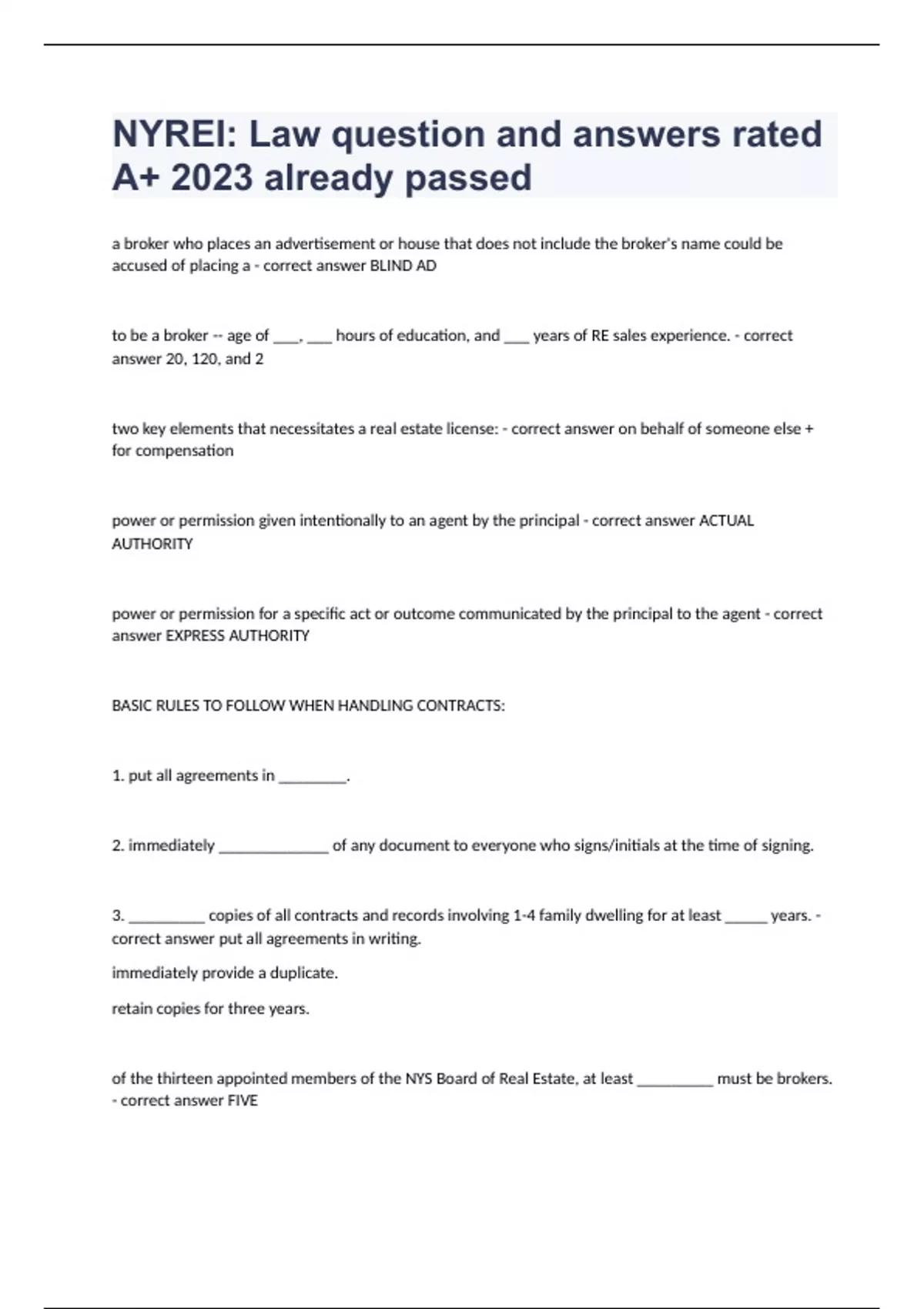 NYREI: Law question and answers rated A+ 2023 already passeda broker who places an advertisement or house that does not include the broker's name could be accused of placing a - correct answer BLIND AD to be a broker -- age of ___, ___ hours of education, and ___ years of RE sales experience. - correct answer 20, 120, and 2 two key elements that necessitates a real estate license: - correct answer on behalf of someone else + for compensation power or permission given intentionally to an agent by the principal - correct answer ACTUAL AUTHORITY power or permission for a specific act or outcome communicated by the principal to the agent - correct answer EXPRESS AUTHORITY BASIC RULES TO FOLLOW WHEN HANDLING CONTRACTS: 1. put all agreements in ________. 2. immediately _____________ of any document to everyone who signs/initials at the time of signing. 3. _________ copies of all contracts and records involving 1-4 family dwelling for at least _____ years. - correct answer put all agreements in writing. immediately provide a duplicate. retain copies for three years. of the thirteen appointed members of the NYS Board of Real Estate, at least _________ must be brokers. - correct answer FIVE