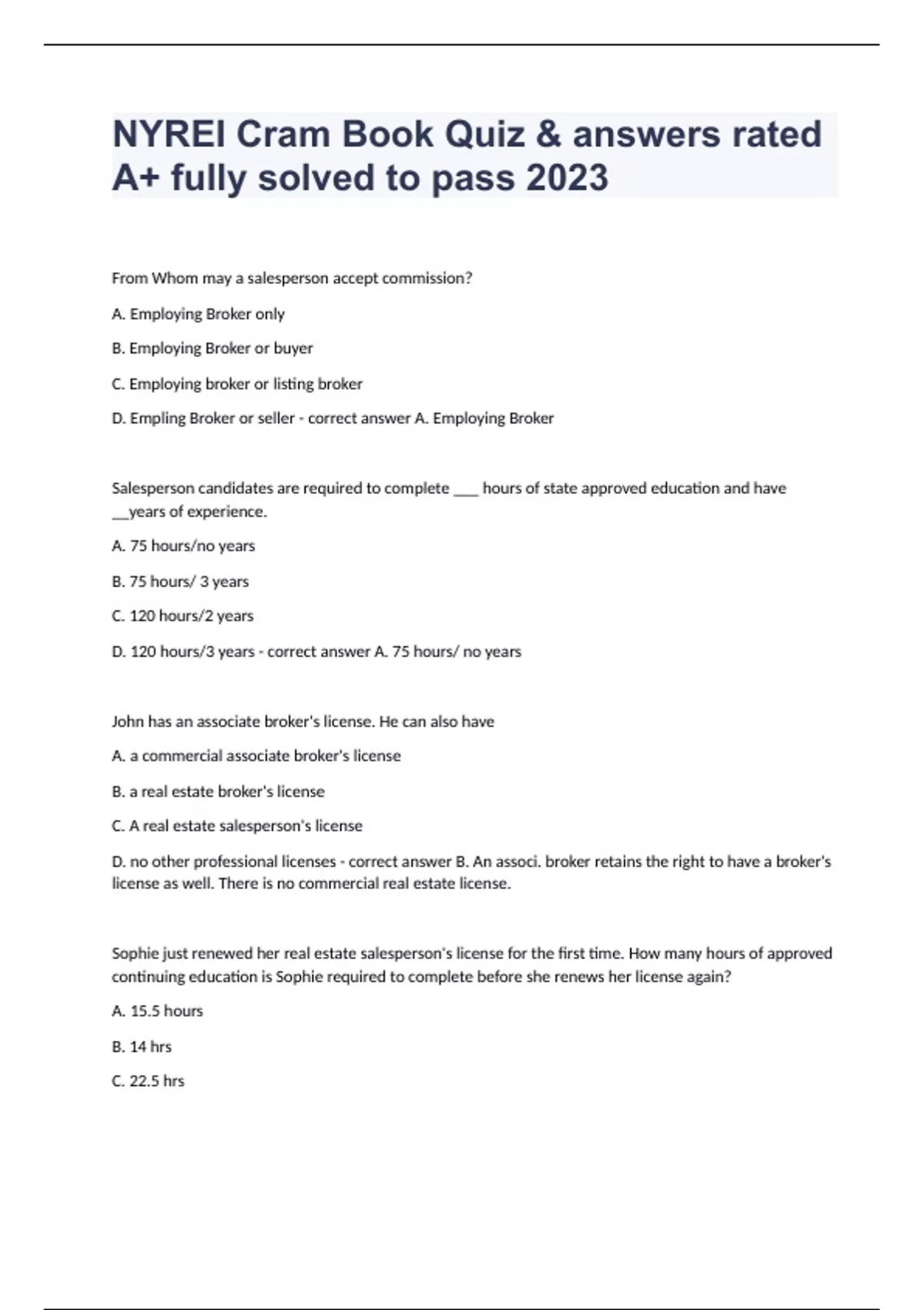 NYREI Cram Book Quiz & answers rated A+ fully solved to pass 2023From Whom may a salesperson accept commission? A. Employing Broker only B. Employing Broker or buyer C. Employing broker or listing broker D. Empling Broker or seller - correct answer A. Employing Broker Salesperson candidates are required to complete ___ hours of state approved education and have __years of experience. A. 75 hours/no years B. 75 hours/ 3 years C. 120 hours/2 years D. 120 hours/3 years - correct answer A. 75 hours/ no years John has an associate broker's license. He can also have A. a commercial associate broker's license B. a real estate broker's license C. A real estate salesperson's license D. no other professional licenses - correct answer B. An associ. broker retains the right to have a broker's license as well. There is no commercial real estate license. Sophie just renewed her real estate salesperson's license for the first time. How many hours of approved continuing education is Sophie required to complete before she renews her license again? A. 15.5 hours B. 14 hrs C. 22.5 hrs D. 25 hrs - correct answer C. 22.5 hours of CE Salesperson Greg works for Tom Ace, owner of Ace realty. He decides to spend his own money to take out an extra ad for a home he's really eager to sell. Which statement about this ad is true? A. Greg must include his name, phone number and license status B. Only Greg's broker is allowed to place an ad. C. Since Greg is paying for the ad, he can put whatever he wants on it. D. The sign must include Ace Realty and the office phone number. - correct answer D. The law requires that the Brokers business name and and phone number appear on all advertising Harry and his wife buy a small apartment building in Watertown and they're ready to hire resources to help run it. Who would need to have a real estate license? A. Ella, Harry's otherwise unemployed neighbor whom he hires to collect rents from the tenants. B. Joe, an employee of Ace Property Mgmt. C. Kyl, who works for Joe as a plumber and general handyman D. Harry's wife the she decides to sell the property as a FSBO - correct answer B. Only Joe needs one bc he works for a property management company All four of the real estate licensees who work for Joe Wilson, owner of Wilson Realty Inc., have passed the NYRE broker's exam and have received their licenses. How many broker licenses must be having on the wall at Wilson Realty? A. 1 B. 2. C. 4 D. 5 - correct answer A. Joe has one broker's license, most likely a Class 31 Corp. Broker's license. Although the others have the education and experience and passed the broker's exam, they are associate brokers since they are employed by Joe. Only the broker's licensed is required to be displayed. What is a novation? A. an amendment to a contract B. an assignment of a contract C. an assumption of a contract
