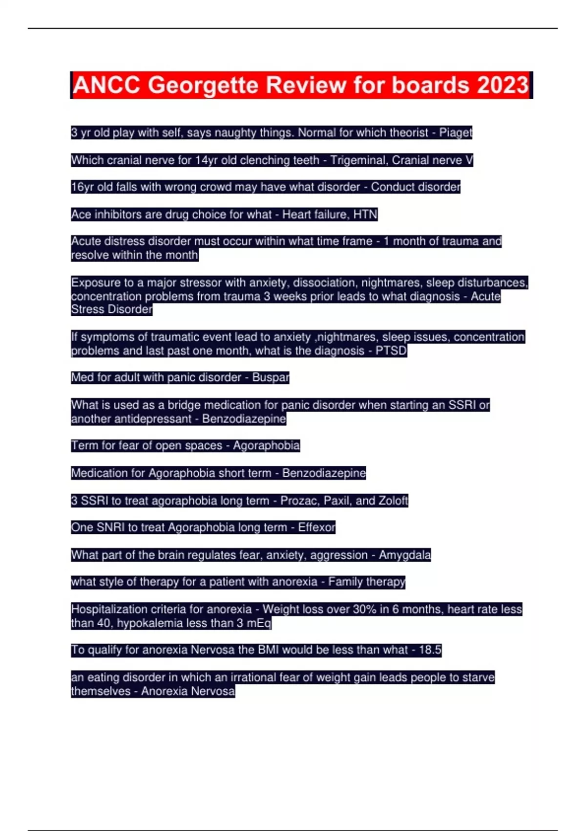 3 yr old play with self, says naughty things. Normal for which theorist - Piaget Which cranial nerve for 14yr old clenching teeth - Trigeminal, Cranial nerve V 16yr old falls with wrong crowd may have what disorder - Conduct disorder Ace inhibitors are drug choice for what - Heart failure, HTN Acute distress disorder must occur within what time frame - 1 month of trauma and resolve within the month Exposure to a major stressor with anxiety, dissociation, nightmares, sleep disturbances, concentration problems from trauma 3 weeks prior leads to what diagnosis - Acute Stress Disorder If symptoms of traumatic event lead to anxiety ,nightmares, sleep issues, concentration problems and last past one month, what is the diagnosis - PTSD Med for adult with panic disorder - Buspar What is used as a bridge medication for panic disorder when starting an SSRI or another antidepressant - Benzodiazepine Term for fear of open spaces - Agoraphobia Medication for Agoraphobia short term - Benzodiazepine 3 SSRI to treat agoraphobia long term - Prozac, Paxil, and Zoloft One SNRI to treat Agoraphobia long term - Effexor What part of the brain regulates fear, anxiety, aggression - Amygdala what style of therapy for a patient with anorexia - Family therapy Hospitalization criteria for anorexia - Weight loss over 30% in 6 months, heart rate less than 40, hypokalemia less than 3 mEq To qualify for anorexia Nervosa the BMI would be less than what - 18.5 an eating disorder in which an irrational fear of weight gain leads people to starve themselves - Anorexia Nervosa Cell death in aging/elderly is known as what - Apoptosis A process of building on what works rather than focusing on and fixing what doesn't is known as what - Appreciative Inquiry In this stage a person has no intent to change - Precontemplation In this stage the person is thinking of change and aware of the problem but not committed to change - Contemplation In this stage the person has made the decision to change and is ready for action - Preparation In this stage the person is engaging in specific actions to change - Action This is taken 15 minutes before sex - Avanafil (Stendra) Take this 45 minutes before sex - Tadalafil (Cialis) and Vardenafil (Levitra) Take this one hour before sex - Sildenafil (Viagra) According to Beck depression scale, 0-13 is considered - Minimal Depression According to Beck depression scale, 14-19 is considered - Mild Depression According to Beck depression scale, 20-28 is considered - Moderate Depression According to Beck depression scale, 29-63 is considered - Severe Depression Strong inhibitors of 2D6 (Big Freaking Problem) - Bupropion, Fluoxetine, Paxil Can Asthma medication cause depression - yes Can Buspar be taken during pregnancy - Catagory B, only take if really needed Can Klonopin be taken during pregnancy - Category C, Avoid. Excretes in breastmilk and baby can withdrawal Strong inducers of 3A4 - Carb and Barb (Carbazepine and Phenobarbital) Who is in charge of DEA - State and Federal Clomipramine (Anafranil) treats - OCD and depression DC Clozaril if ANC is below - 1000