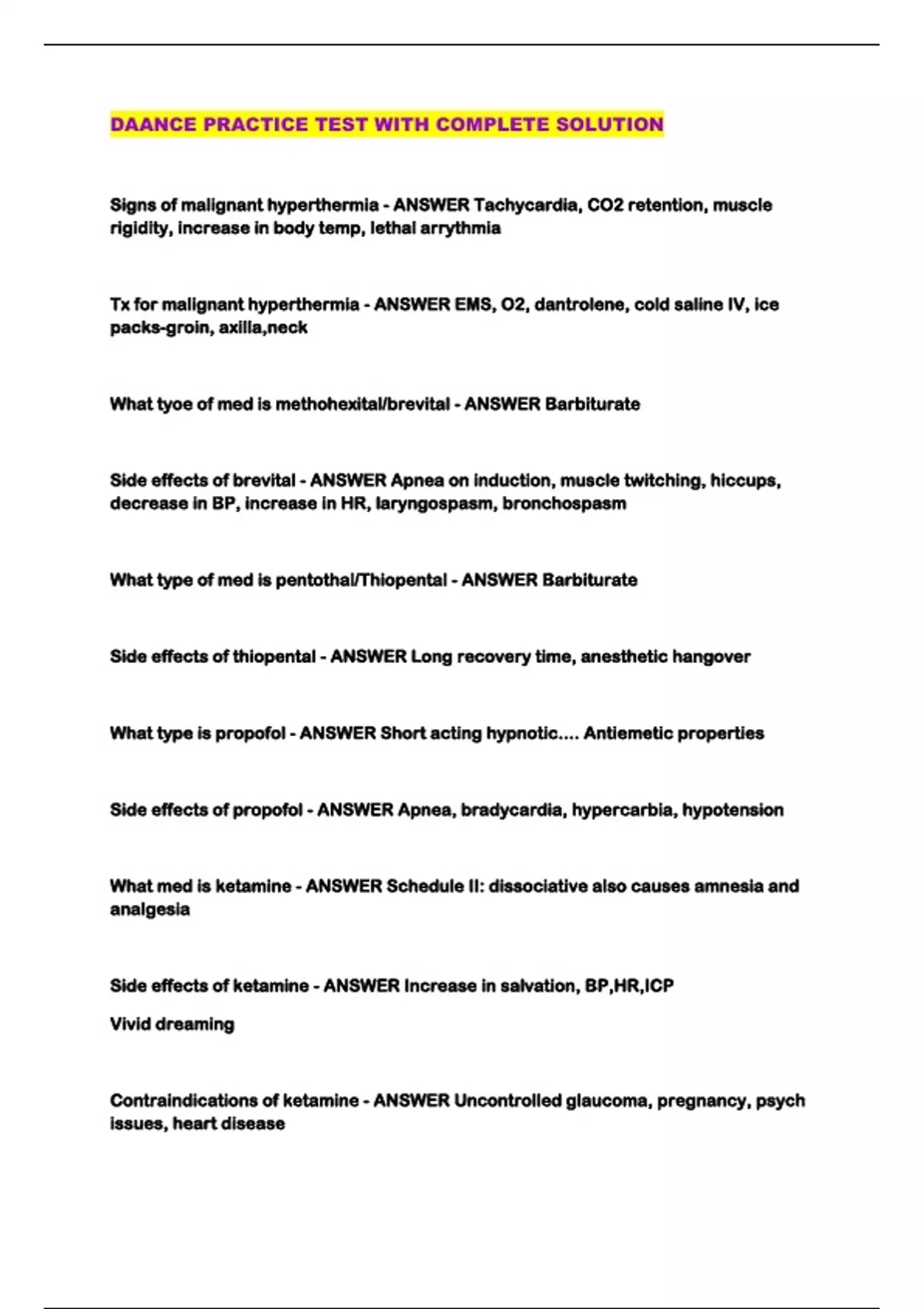 Signs of malignant hyperthermia - ANSWER Tachycardia, CO2 retention, muscle rigidity, increase in body temp, lethal arrythmia Tx for malignant hyperthermia - ANSWER EMS, O2, dantrolene, cold saline IV, ice packs-groin, axilla,neck What tyoe of med is methohexital/brevital - ANSWER Barbiturate Side effects of brevital - ANSWER Apnea on induction, muscle twitching, hiccups, decrease in BP, increase in HR, laryngospasm, bronchospasm What type of med is pentothal/Thiopental - ANSWER Barbiturate Side effects of thiopental - ANSWER Long recovery time, anesthetic hangover What type is propofol - ANSWER Short acting hypnotic.... Antiemetic properties Side effects of propofol - ANSWER Apnea, bradycardia, hypercarbia, hypotension What med is ketamine - ANSWER Schedule II: dissociative also causes amnesia and analgesia Side effects of ketamine - ANSWER Increase in salvation, BP,HR,ICP Vivid dreaming Contraindications of ketamine - ANSWER Uncontrolled glaucoma, pregnancy, psych issues, heart diseaseBasic requisites of aesthetic - ANSWER Nontoxic Non flammable