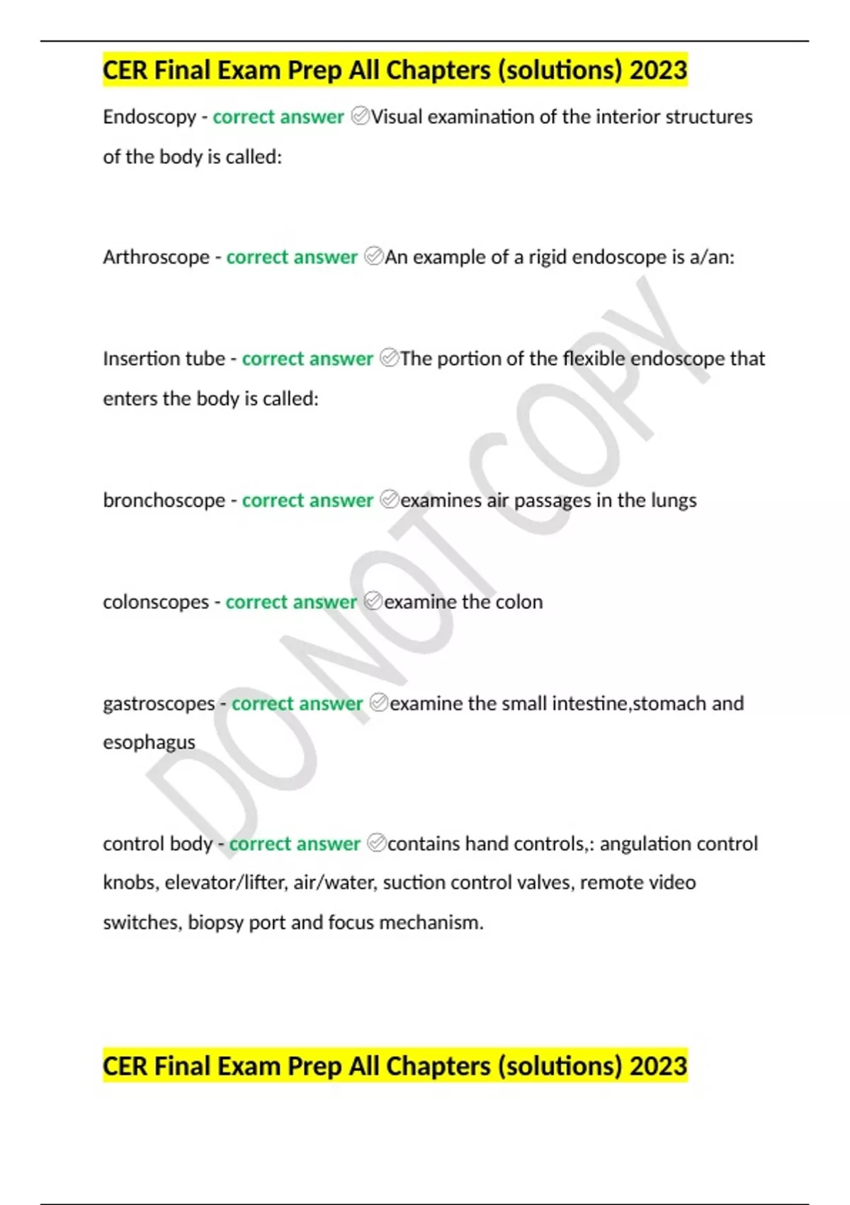 CER Final Exam Prep All Chapters (solutions) 2023 Endoscopy - correct answer ✅Visual examination of the interior structures of the body is called: