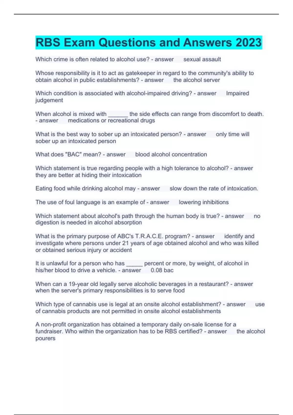 RBS Exam Questions and Answers 2023 Which crime is often related to alcohol use? sexual assault Whose responsibility is it to act as gatekeeper in regard to the community's ability to obtain alcohol in public establishments? the alcohol server Which condition is associated with alcohol-impaired driving? Impaired judgement When alcohol is mixed with ______ the side effects can range from discomfort to death. medications or recreational drugs What is the best way to sober up an intoxicated person? only time will sober up an intoxicated person What does "BAC" mean? blood alcohol concentration Which statement is true regarding people with a high tolerance to alcohol? they are better at hiding their intoxication Eating food while drinking alcohol may slow down the rate of intoxication. The use of foul language is an example of lowering inhibitions Which statement about alcohol's path through the human body is true? no digestion is needed in alcohol absorption What is the primary purpose of ABC's T.R.A.C.E. program? identify and investigate where persons under 21 years of age obtained alcohol and who was killed or obtained serious injury or accident It is unlawful for a person who has _____ percent or more, by weight, of alcohol in his/her blood to drive a vehicle. 0.08 bac When can a 19-year old legally serve alcoholic beverages in a restaurant? when the server's primary responsibilities is to serve food Which type of cannabis use is legal at an onsite alcohol establishment? use of cannabis products are not permitted in onsite alcohol establishments A non-profit organization has obtained a temporary daily on-sale license for a fundraiser. Who within the organization has to be RBS certified? the alcohol pourers The failure of a licensee to comply with the RBS program requirements shall be grounds for disciplinary action. Security personnel, whose post is located outside the entrance to an alcohol establishment, has the primary responsibility to control the number of patrons entering and to check their IDs. Does the bouncer need to be certified? Yes, because security personnel check IDs. Infractions are punishable by fine What does "RBS" mean? Responsible Beverage Service What is the maximum penalty for serving alcohol after hours? 6 months in jail A member of a group of patrons becomes obviously intoxicated. What should the server do? inform the other group members that the obviously intoxicated patron will no longer be served alcohol A legally acceptable ID has which characteristic? issued by a government agency Which statement regarding state issued identification cards is true? they are a valid proof of age PCP is an example of a(n) Hallucinogen Which substance is considered a depressant? alcohol What is embossed on the holder's picture on a California Real ID? their birthdate Which feature is located on the back of a valid California driver license? barcode