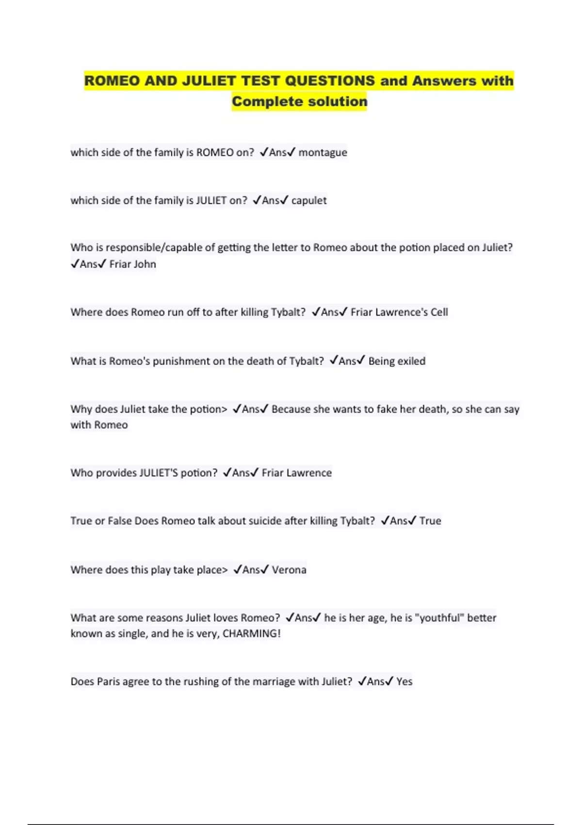 romeo and juliet test with complete solution