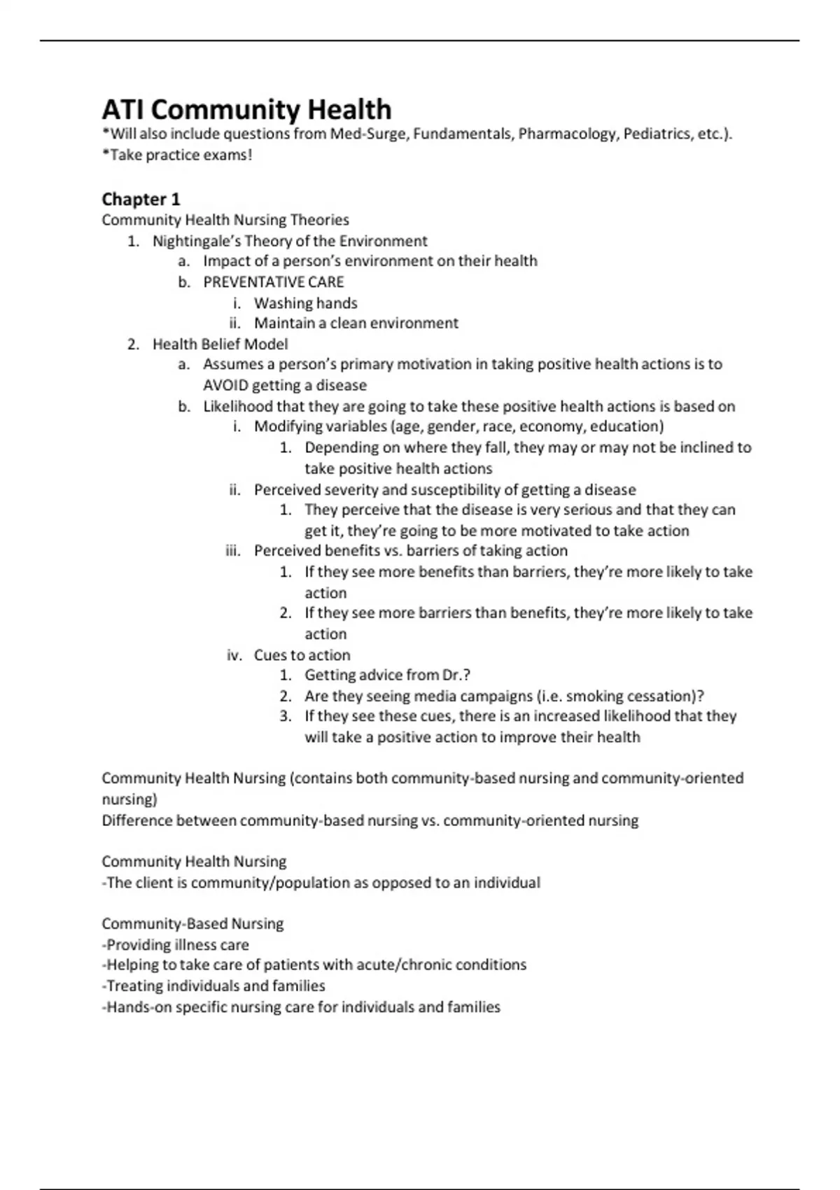 ATI Community Health*Will also include questions from Med-Surge, Fundamentals, Pharmacology, Pediatrics, etc.).*Take practice exams! Chapter 1 Community Health Nursing Theories1.Nightingale's Theory of the Environmenta. Impact of a person's environment on their health....