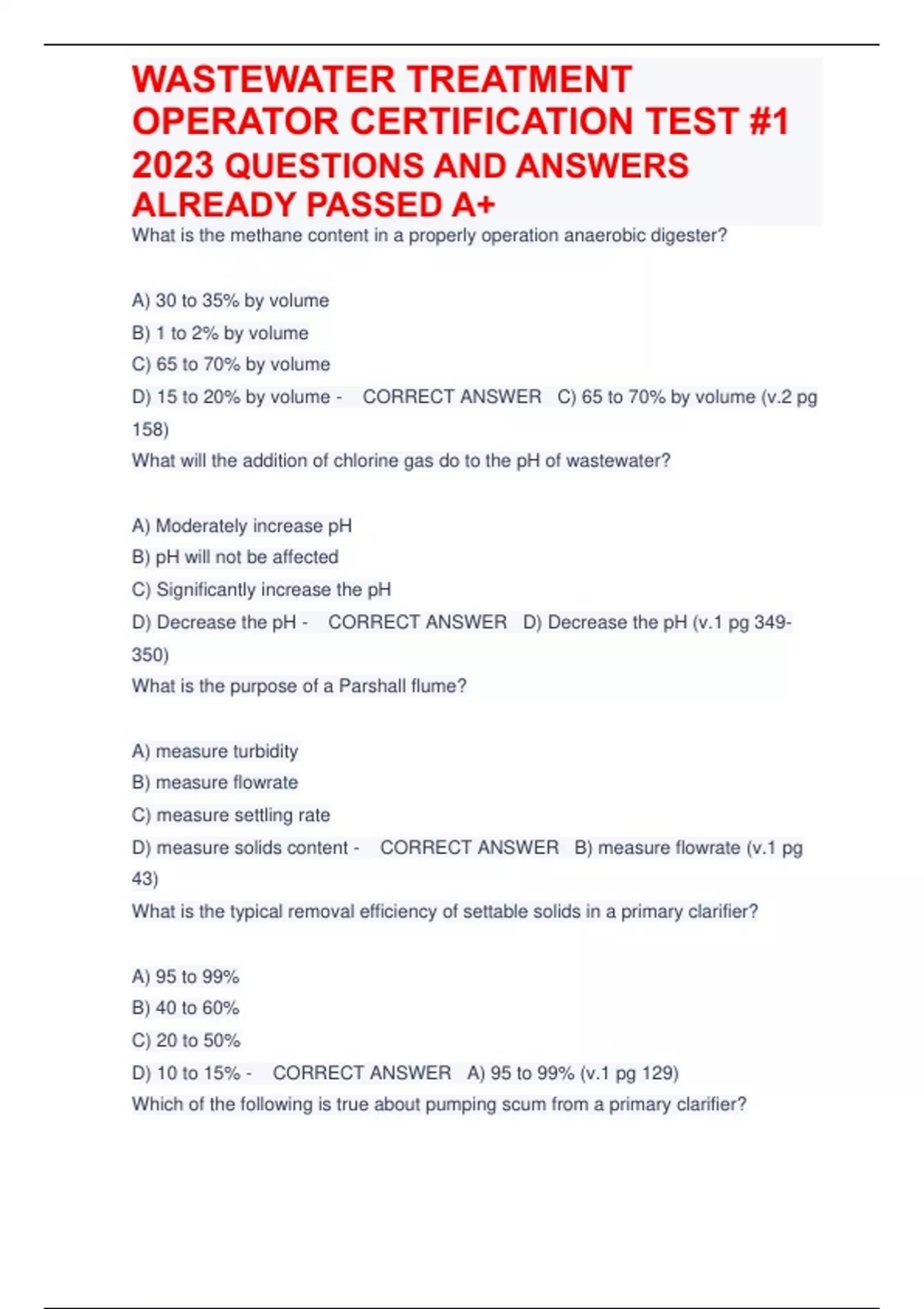 What is the methane content in a properly operation anaerobic digester? A) 30 to 35% by volume B) 1 to 2% by volume C) 65 to 70% by volume D) 15 to 20% by volume - CORRECT ANSWER C) 65 to 70% by volume (v.2 pg 158) What will the addition of chlorine gas do to the pH of wastewater? A) Moderately increase pH B) pH will not be affected C) Significantly increase the pH D) Decrease the pH - CORRECT ANSWER D) Decrease the pH (v.1 pg 349-350) What is the purpose of a Parshall flume? A) measure turbidity B) measure flowrate C) measure settling rate D) measure solids content - CORRECT ANSWER B) measure flowrate (v.1 pg 43) What is the typical removal efficiency of settable solids in a primary clarifier? A) 95 to 99% B) 40 to 60% C) 20 to 50% D) 10 to 15% - CORRECT ANSWER A) 95 to 99% (v.1 pg 129) Which of the following is true about pumping scum from a primary clarifier? A) Pumping scum is less problematic during colder weather. B) Scum rarely leads to plugged pipelines due to its viscous nature. C) Scum causes more piping problems than other substances pumped at a wastewater treatment plant. D) Scum causes the least amount of piping problems among all the substances pumped at a wastewater treatment plant. - CORRECT ANSWER C) Scum causes more piping problems than other substances pumped at a wastewater treatment plant. (v.2 pg 449) What might cause thick billows of white sudsy foam in the aeration tank? A) MLSS is too high B) Temperature in the aeration tank is too low C) Old sludge D) MLSS is too low - CORRECT ANSWER D) MLSS is too low (v.2 pg 53,75) What does the "M" in F/M ratio represent? A) MLSS in aeration tank B) The influent BOD loading rate into the aeration tank C) The mixed liquor volatile suspended solids in the aeration tank D) The mass of inorganic solids in the aeration tank - CORRECT ANSWER C) The mixed liquor volatile suspended solids in the aeration tank (v.2 pg 16) In general, how will warmer temperature affect the settling rate of solids in a clarifier? A) Decrease settling rate B) Increase the settling rate C) Temperature will not affect the settling rate D) Worsen the settling rate - CORRECT ANSWER B) Increase the settling rate (v.1 pg 134) What could happen if the digester gas is mixed with air (85 to 95% by volume)? A) Cause an explosion B) Improve efficiency of digestion C) The bacteria will become aerobic and increase VSR D) The digester becomes safer to operate due to less toxic gas in the system - CORRECT ANSWER A) Cause an explosion (v.2 pg 158) How will algae impact the chlorine demand in the pond effluent? A) Slightly decreases chlorine demand B) Does not affect chlorine