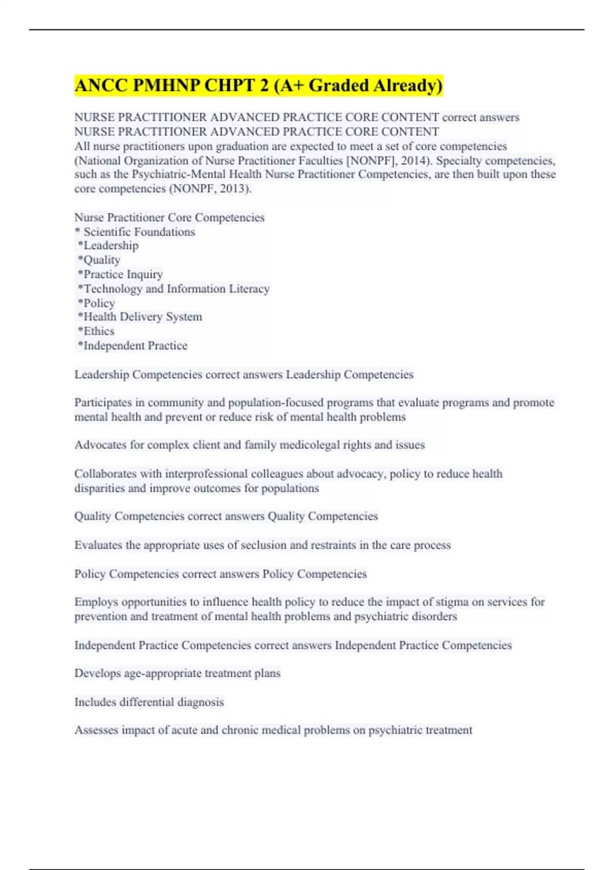 NURSE PRACTITIONER ADVANCED PRACTICE CORE CONTENT correct answers NURSE PRACTITIONER ADVANCED PRACTICE CORE CONTENT All nurse practitioners upon graduation are expected to meet a set of core competencies (National Organization of Nurse Practitioner Faculties [NONPF], 2014). Specialty competencies, such as the Psychiatric-Mental Health Nurse Practitioner Competencies, are then built upon these core competencies (NONPF, 2013). Nurse Practitioner Core Competencies * Scientific Foundations *Leadership *Quality *Practice Inquiry *Technology and Information Literacy *Policy *Health Delivery System *Ethics *Independent Practice Leadership Competencies correct answers Leadership Competencies Participates in community and population-focused programs that evaluate programs and promote mental health and prevent or reduce risk of mental health problems Advocates for complex client and family medicolegal rights and issues Collaborates with interprofessional colleagues about advocacy, policy to reduce health disparities and improve outcomes for populations Quality Competencies correct answers Quality Competencies Evaluates the appropriate uses of seclusion and restraints in the care process Policy Competencies correct answers Policy Competencies Employs opportunities to influence health policy to reduce the impact of stigma on services for prevention and treatment of mental health problems and psychiatric disorders Independent Practice Competencies correct answers Independent Practice Competencies Develops age-appropriate treatment plans Includes differential diagnosis Assesses impact of acute and chronic medical problems on psychiatric treatment