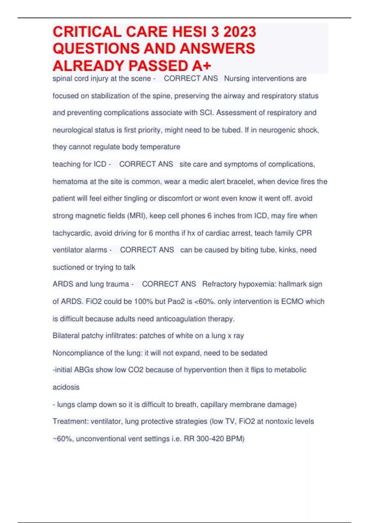 CRITICAL CARE HESI 3 2023 QUESTIONS AND ANSWERS ALREADY PASSED A+