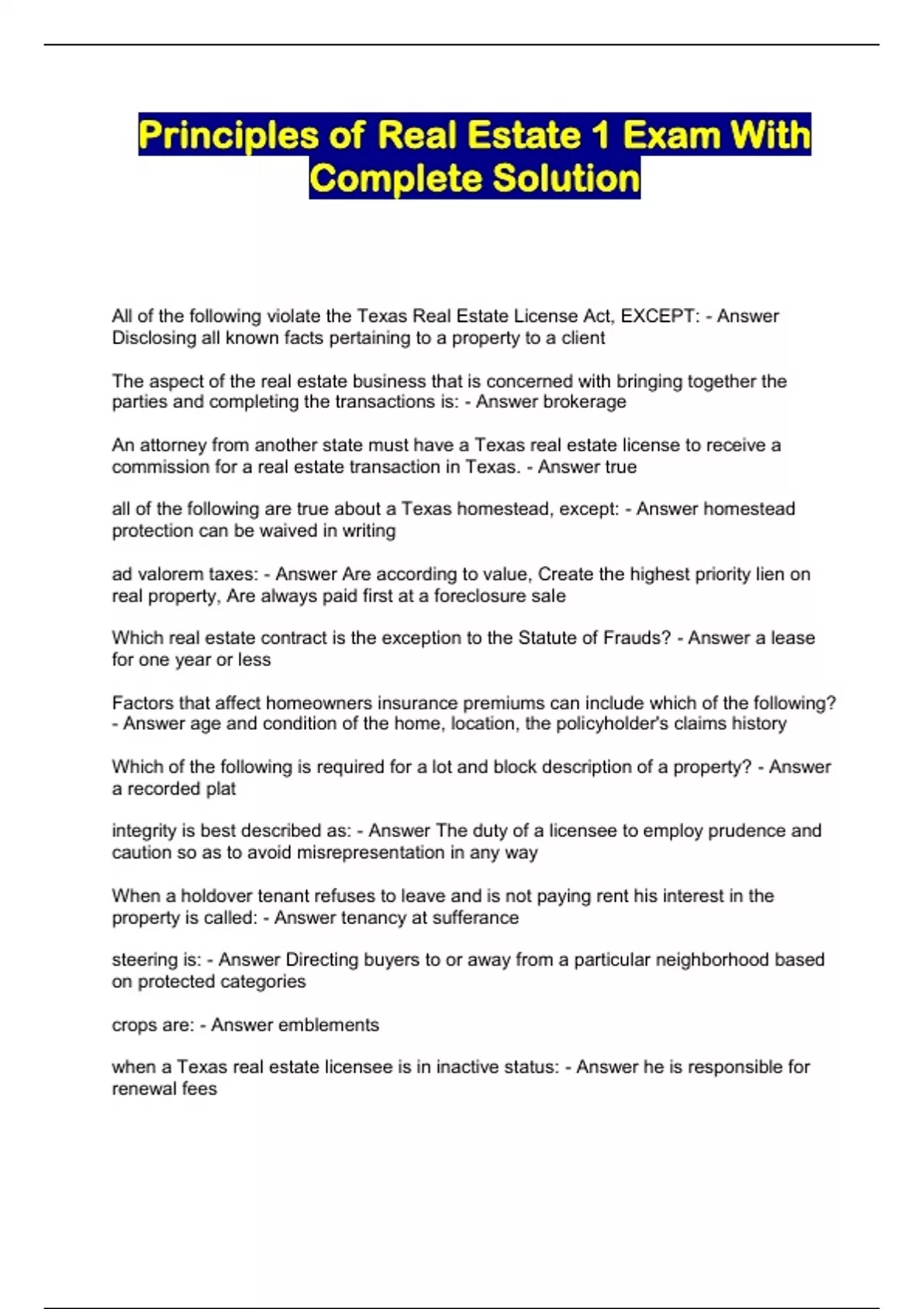 Principles of Real Estate 1 Exam With Complete Solution...