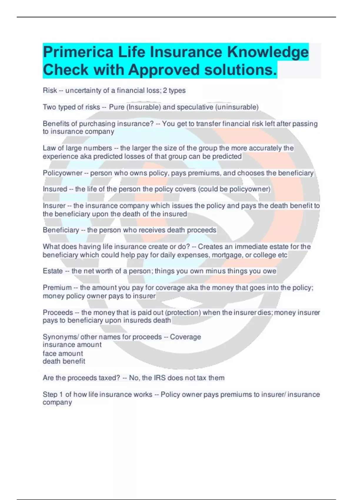 Primerica Life Insurance Knowledge Check with Approved solutions | Latest 2023/2024