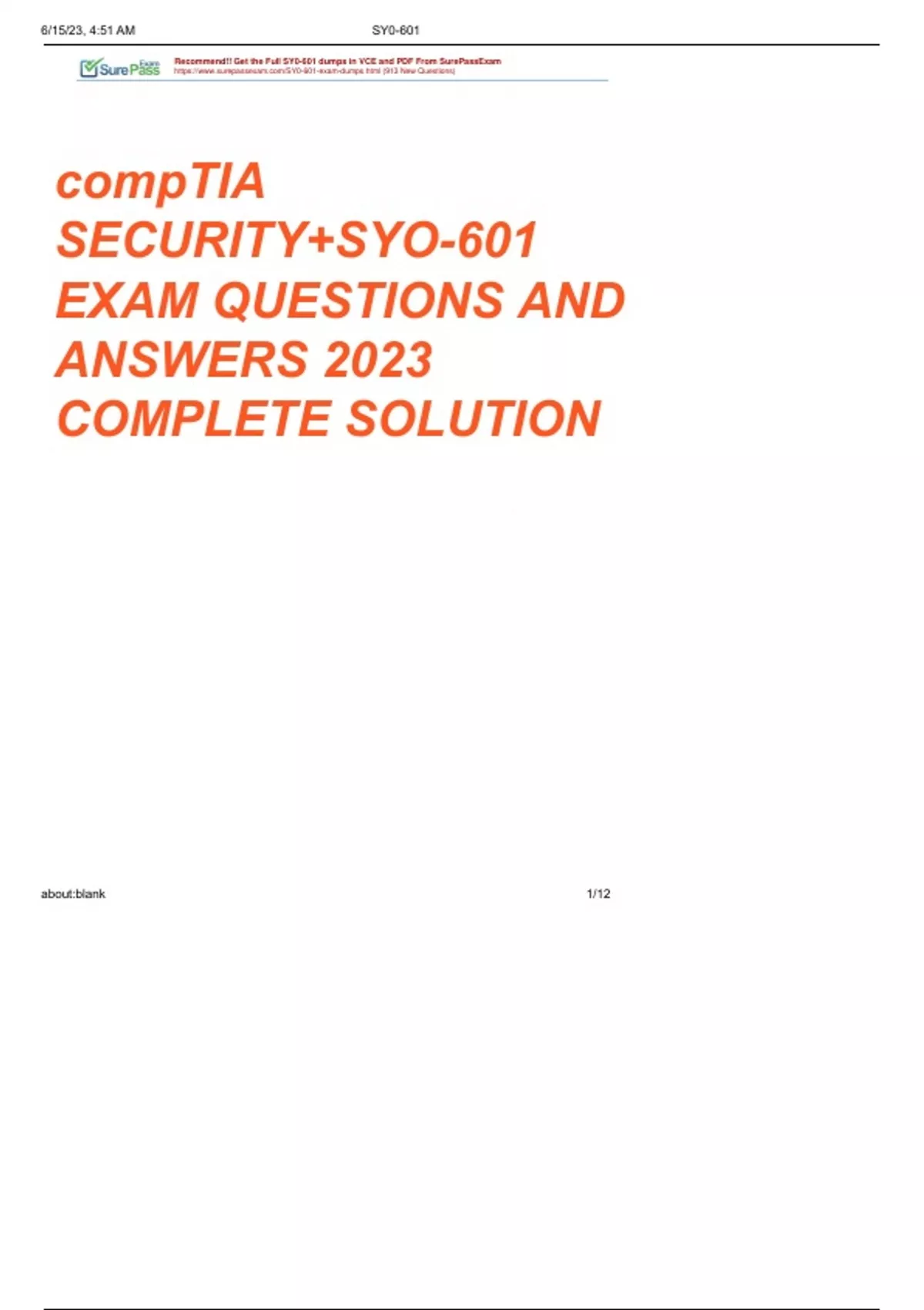 COMPTIA SECURITY+ SY0-601 QUESTIONS. EXAM QUESTIONS AND ANSWERS (2023) (VERIFIED ANSWERS BY EXPERT)