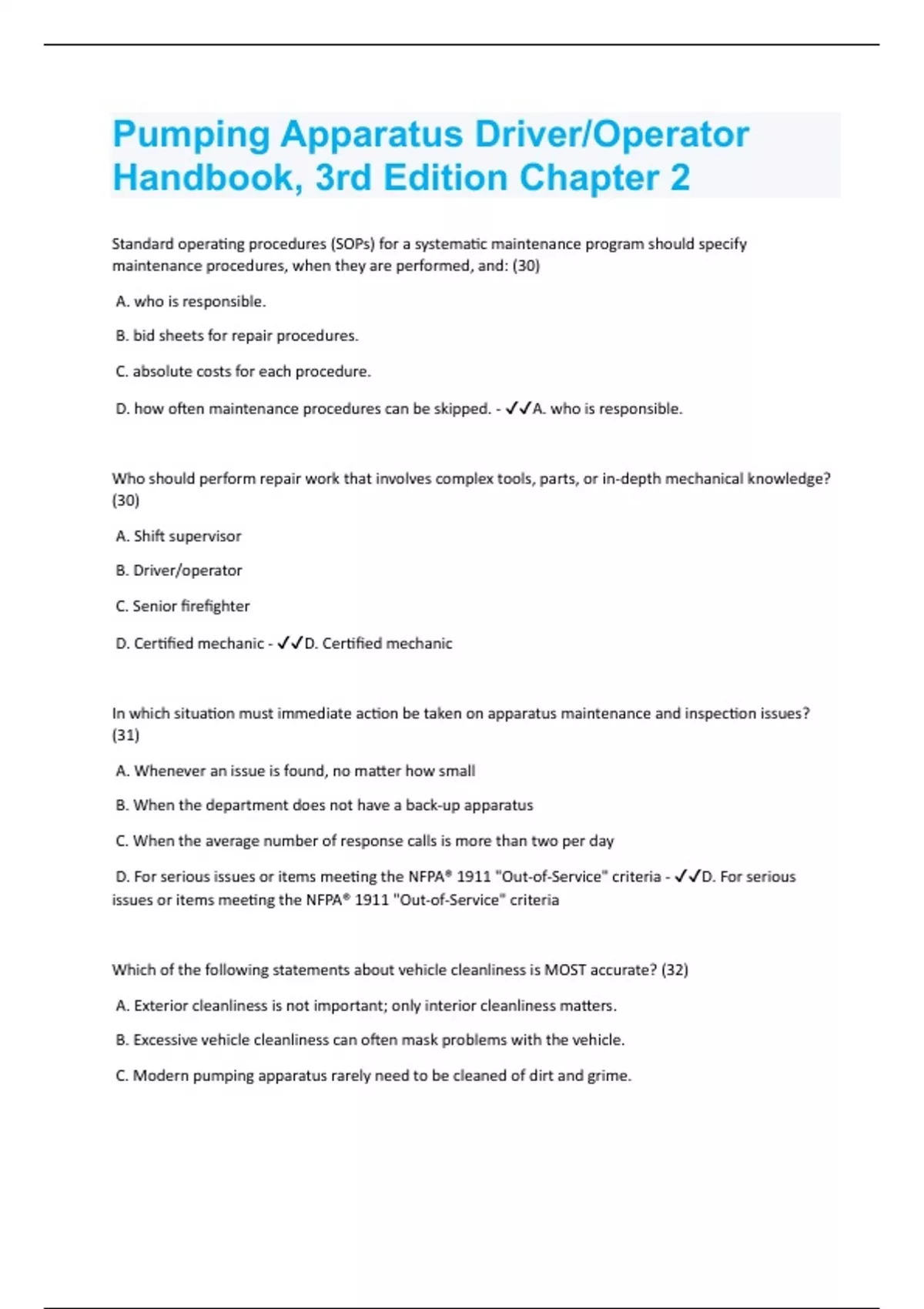 Standard operating procedures (SOPs) for a systematic maintenance program should specify maintenance procedures, when they are performed, and: (30) A. who is responsible. B. bid sheets for repair procedures. C. absolute costs for each procedure. D. how often maintenance procedures can be skipped. - A. who is responsible. Who should perform repair work that involves complex tools, parts, or in-depth mechanical knowledge? (30) A. Shift supervisor B. Driver/operator C. Senior firefighter D. Certified mechanic - D. Certified mechanic In which situation must immediate action be taken on apparatus maintenance and inspection issues? (31) A. Whenever an issue is found, no matter how small B. When the department does not have a back-up apparatus C. When the average number of response calls is more than two per day D. For serious issues or items meeting the NFPA® 1911 "Out-of-Service" criteria - D. For serious issues or items meeting the NFPA® 1911 "Out-of-Service" criteria Which of the following statements about vehicle cleanliness is MOST accurate? (32) A. Exterior cleanliness is not important; only interior cleanliness matters. B. Excessive vehicle cleanliness can often mask problems with the vehicle. C. Modern pumping apparatus rarely need to be cleaned of dirt and grime.D. Proper inspection of apparatus is easier when parts are free of dirt and grime. - D. Proper inspection of apparatus is easier when parts are free of dirt and grime.