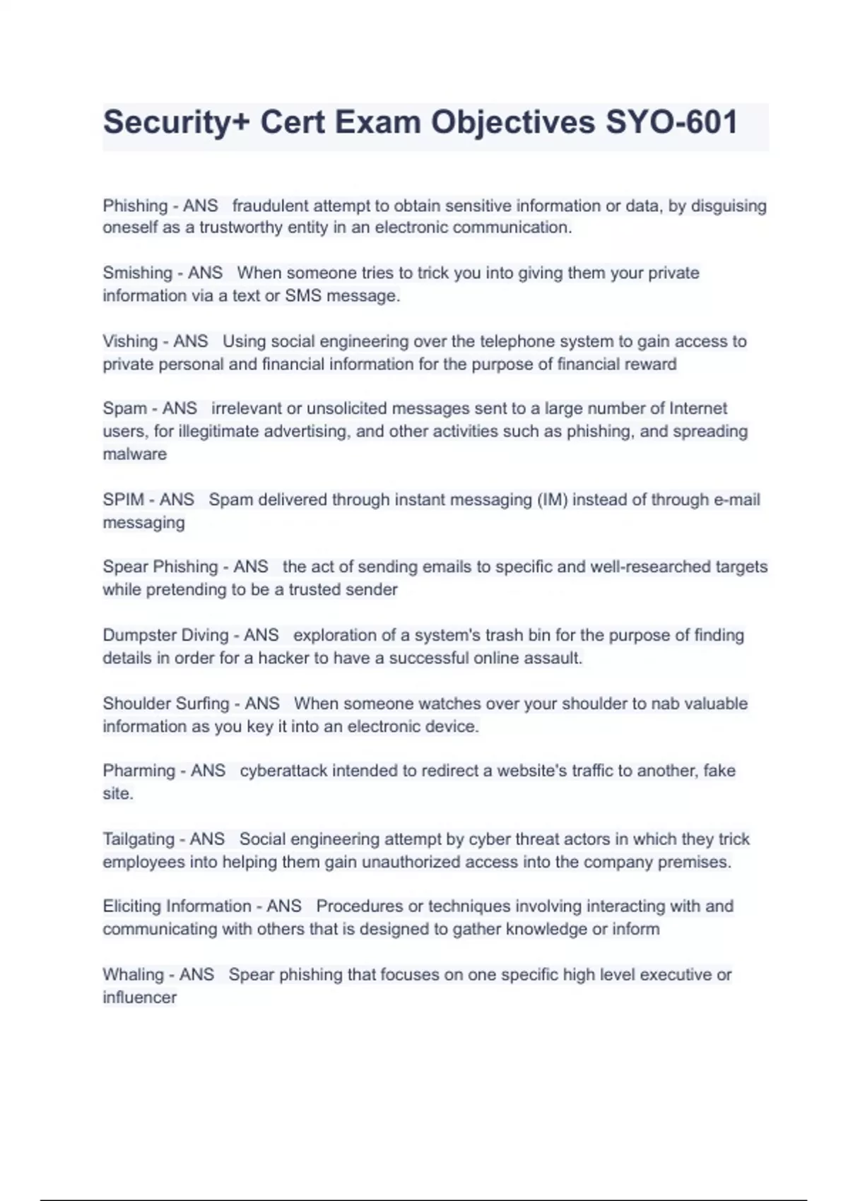 Security+ Cert Exam Objectives SYO-601 QUESTIONS AND VERIFIED ANSWERS LATEST UPDATE Phishing - ANS fraudulent attempt to obtain sensitive information or data, by disguising oneself as a trustworthy entity in an electronic communication. Smishing - ANS When someone tries to trick you into giving them your private information via a text or SMS message. Vishing - ANS Using social engineering over the telephone system to gain access to private personal and financial information for the purpose of financial reward Spam - ANS irrelevant or unsolicited messages sent to a large number of Internet users, for illegitimate advertising, and other activities such as phishing, and spreading malware SPIM - ANS Spam delivered through instant messaging (IM) instead of through e-mail messaging Spear Phishing - ANS the act of sending emails to specific and well-researched targets while pretending to be a trusted sender Dumpster Diving - ANS exploration of a system's trash bin for the purpose of finding details in order for a hacker to have a successful online assault. Shoulder Surfing - ANS When someone watches over your shoulder to nab valuable information as you key it into an electronic device. Pharming - ANS cyberattack intended to redirect a website's traffic to another, fake site. Tailgating - ANS Social engineering attempt by cyber threat actors in which they trick employees into helping them gain unauthorized access into the company premises. Eliciting Information - ANS Procedures or techniques involving interacting with and communicating with others that is designed to gather knowledge or inform Whaling - ANS Spear phishing that focuses on one specific high level executive or influencer Prepending - ANS Prepend is a word that means to attach content as a prefix. For example, a prepend command could be used in a scripting language that a programmer would enter into a certain function or code module. It would add certain characters of text to the beginning of some variable or object. Identity Fraud - ANS identity fraud is the use of stolen information such as making fake ID's and fake bank accounts Invoice Scams - ANS using fraudulent invoices to steal from a company