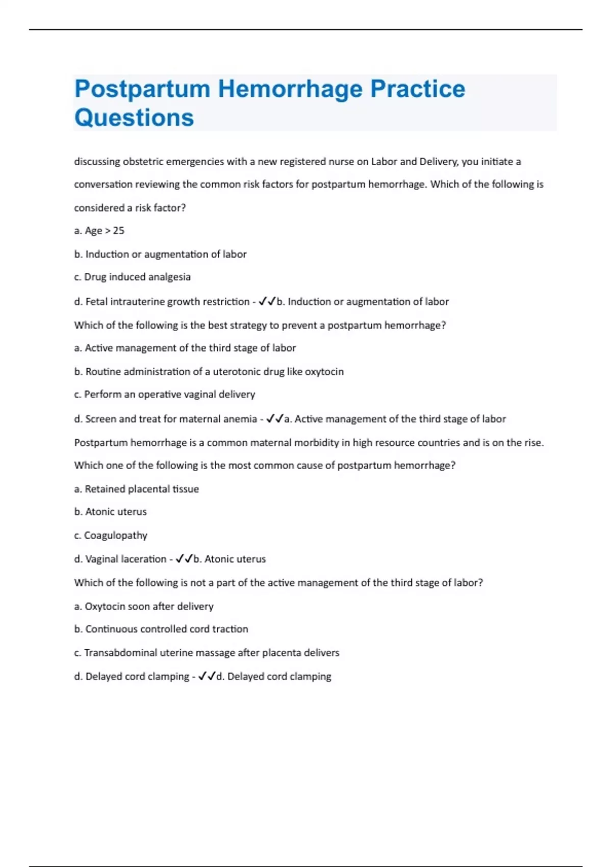 Postpartum Hemorrhage | Questions and Answers with complete solution