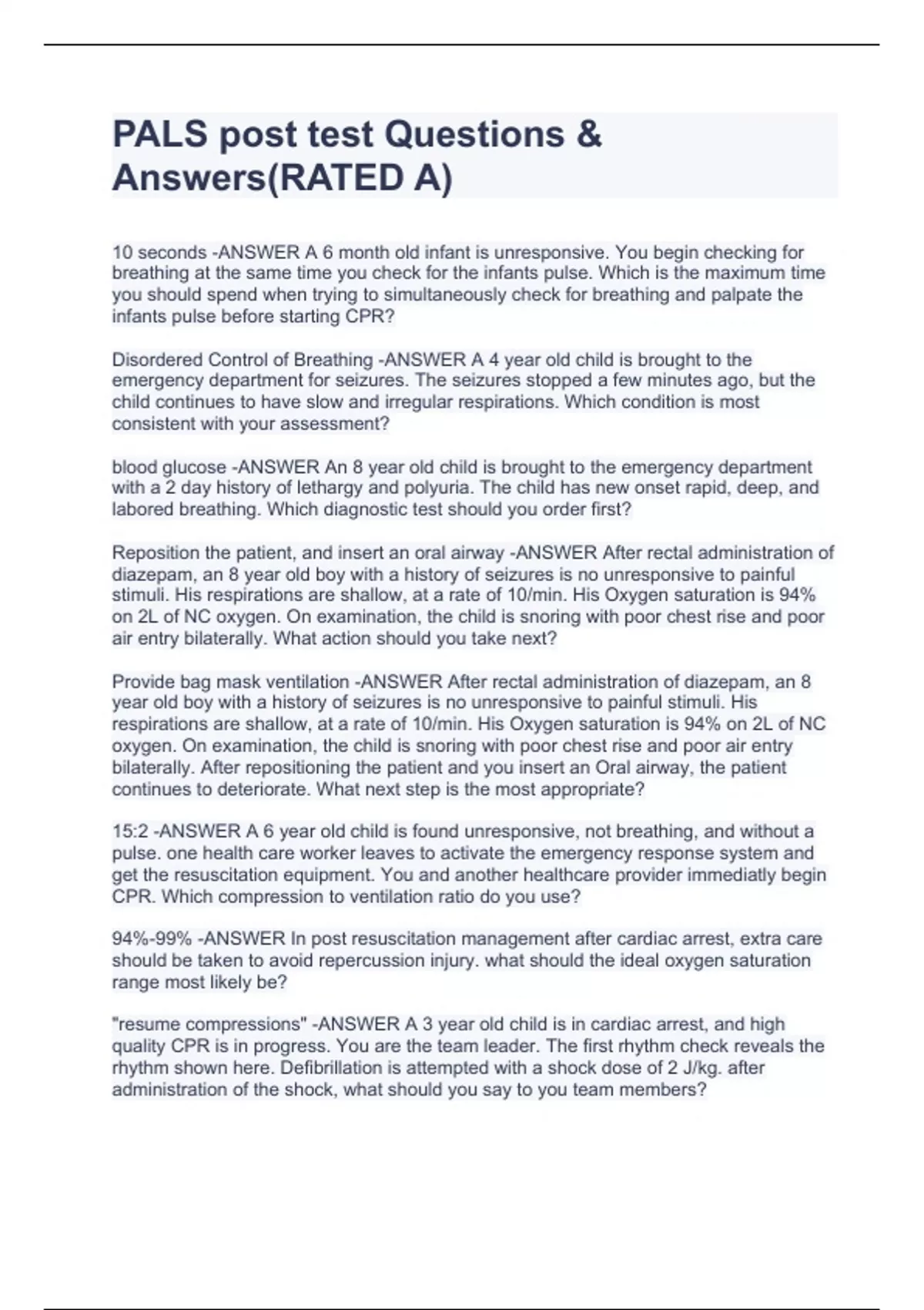 PALS post test Questions & Answers(RATED A)