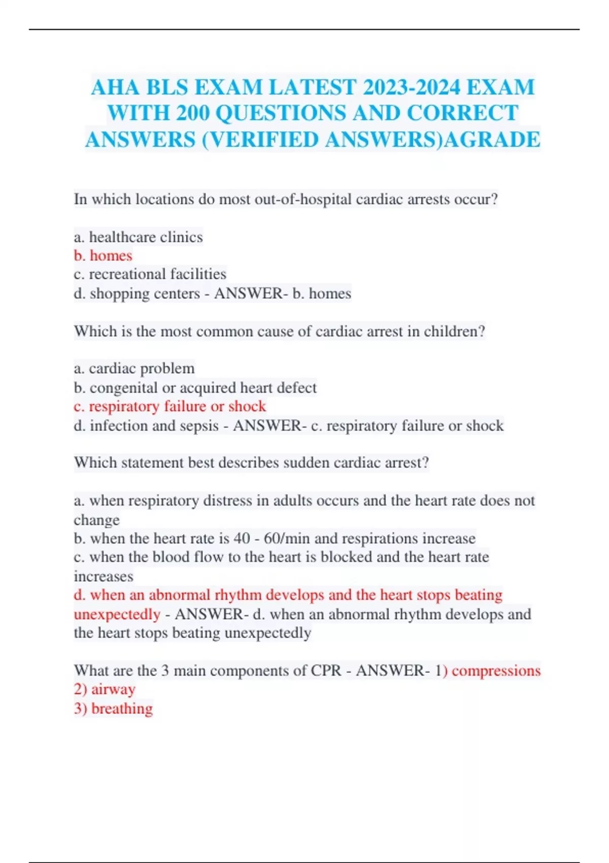 In which locations do most out-of-hospital cardiac arrests occur? a. healthcare clinics b. homes c. recreational facilities d. shopping centers - ANSWER- b. homes Which is the most common cause of cardiac arrest in children? a. cardiac problem b. congenital or acquired heart defect c. respiratory failure or shock d. infection and sepsis - ANSWER- c. respiratory failure or shock Which statement best describes sudden cardiac arrest? a. when respiratory distress in adults occurs and the heart rate does not change b. when the heart rate is 40 - 60/min and respirations increase c. when the blood flow to the heart is blocked and the heart rate increases d. when an abnormal rhythm develops and the heart stops beating unexpectedly - ANSWER- d. when an abnormal rhythm develops and the heart stops beating unexpectedly