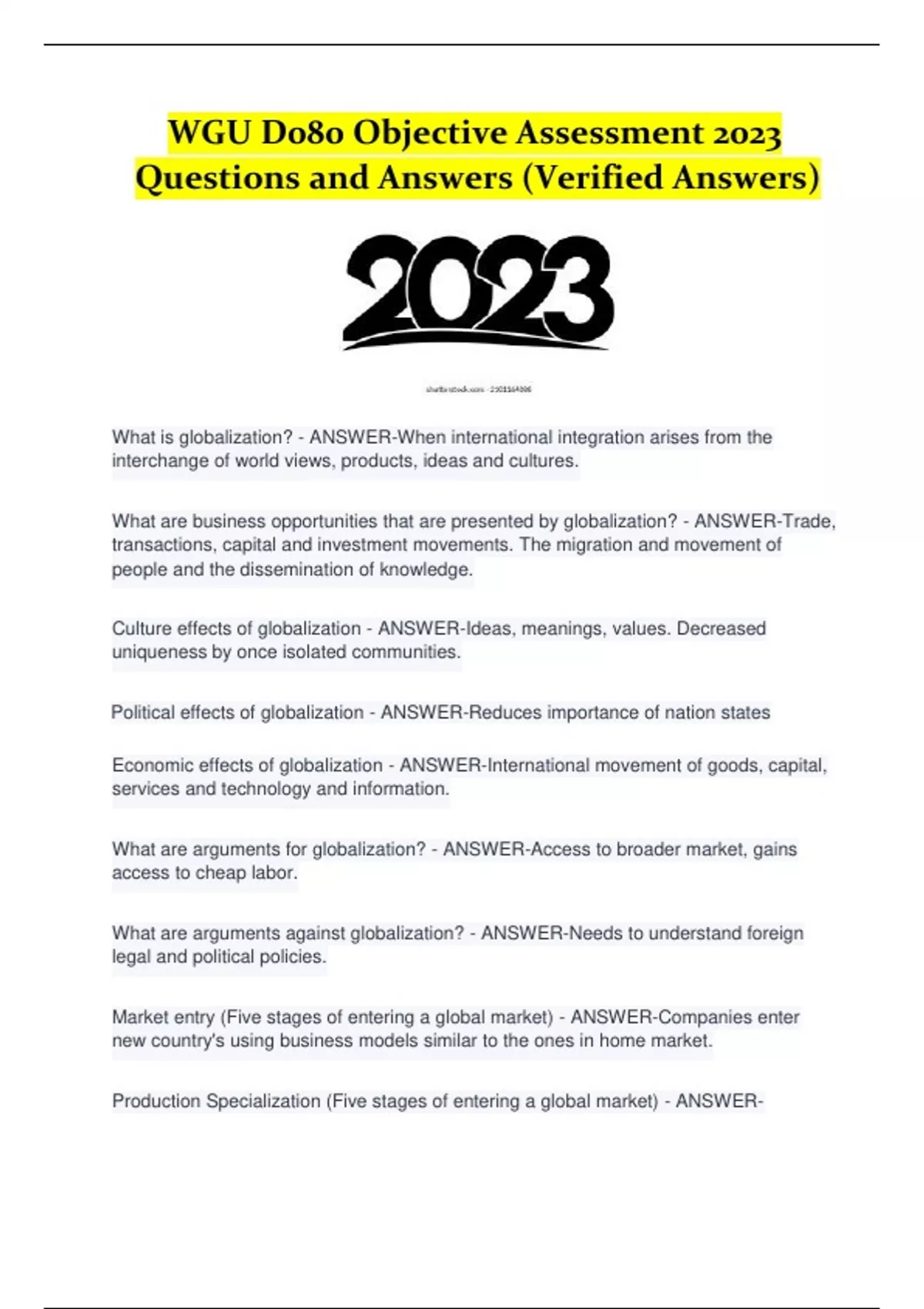 WGU D080 Objective Assessment 2023 Questions and Answers (Verified Answers) What is globalization? - ANSWER -When international integration arises from the interchange of world views, products, ideas and cultures. What are business opportunities that are presented by globalization? - ANSWER -Trade, transactions, capital and investment movements. The migration and movement of people and the dissemination of knowledge. Culture effects of globalization - ANSWER -Ideas, meanings, values. Decreased uniqueness by once isolated communities. Political effects of globalization - ANSWER -Reduces importance of nation states Economic effects of globalization - ANSWER -International movement of goods, capital, services and technology and information. What are arguments for globalization? - ANSWER -Access to broader market, gains access to cheap labor. What are arguments against globalization? - ANSWER -Needs to understand foreign legal and political policies. Market entry (Five stages of entering a global market) - ANSWER -Companies enter new country's using business models similar to the ones in home market. Production Specialization (Five stages of entering a global market) - ANSWER - Companies transfer the full production process of a product to a single location. Value Chain Desegregation (Five stages of entering a global market) - ANSWER Desegregating the the production process and focus on completing each activity in a better location. (different areas) Value Chain Reengineering (Five stages of entering a global market) - ANSWERCompanies seek to further increase their cost savings by reengineering their production process. Creation of New Markets (Five stages of entering a global market) - ANSWER -Allows companies to lower their sticker prices in both new and old markets. Cost Driver (4 drivers of globalization) - ANSWER -Refers to product development, manufacturing, and sourcing. Competitive Driver (4 drivers of globalization) - ANSWER -New markets, increased level of trade. Market Driver (4 drivers of globalization) - ANSWER -Customer needs. Preferences vary by product. Government Driver (4 drivers of globalization) - ANSWER -Absence or presence of trade policies, technical standards, policies and regulations. Economies of Scale - ANSWER -Refers to the concept that the unit cost to produce a product will decline as the variety increases. Benefits of Global Expansion - ANSWER -More array of products, services technologies, medicines, and knowledge Increased sales and exchanges Growth rate in GDP MNC's Benefits of Global Expansion - ANSWER -Unsaturated demand for new product Lower labor costs Less expensive natural resources Higher revenue or lower structure cost MNC's Cost of Global Expansion - ANSWER -Ethical business practice (labor, safety, environment) Organizational structure (incorporating new regions to the value chain) Public relations Leadership Legal and regulatory structure C (CAGE) - ANSWER -Culture. Shared beliefs, practices, norms. A (CAGE) - ANSWER -Administration. Similar country's trade with each other G (CAGE) - ANSWER -Geography. Location E (CAGE) - ANSWER -Economic. Socioeconomic and demiographic World is flat - ANSWER -events that made the world smaller. Monarchy - ANSWER -A single person ruling until death. (Britain) Oligarchy - ANSWER -Small elite group holds power. (Russia) Dictatorship - ANSWER -One person rules (Hitler) Democracy - ANSWER -Citizens organize political parties. (USA) Traditional Economy - ANSWER -Centers around family (hunt gather & nomadic societies) Relies on bartering Members produce what they need not no surplus Benefits: No friction between members Disadvantages: Mercy of climate Low standard of living Ex: Hati Command Econom y - ANSWER -Devoted to goals passed down from a ruler. Resources and business are owned by the government. Communist societies. Venuzela Market Economy - ANSWER -Decentralized economy. Leaders make decisions on consumer demands. Regulates balance between supply and demand.
