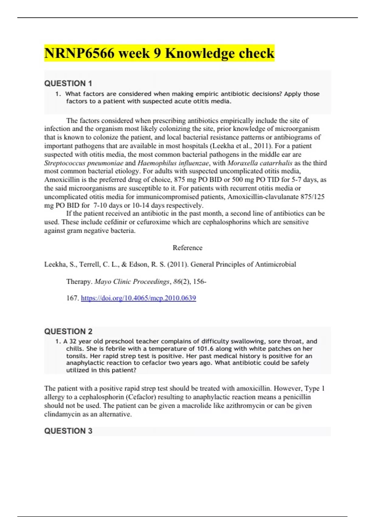 NRNP6566 week 9 Knowledge check QUESTION 1 1. What factors are considered when making empiric antibiotic decisions? Apply those factors to a patient with suspected acute otitis media. QUESTION 2 1. A 32 year old preschool teacher complains of difficulty swallowing, sore throat, and chills. She is febrile with a temperature of 101.6 along with white patches on her tonsils. Her rapid strep test is positive. Her past medical history is positive for an anaphylactic reaction to cefaclor two years ago. What antibiotic could be safely utilized in this patient? NRNP6566 week 9 Knowledge check The factors considered when prescribing antibiotics empirically include the site of infection and the organism most likely colonizing the site, prior knowledge of microorganism that is known to colonize the patient, and local bacterial resistance patterns or antibiograms of important pathogens that are available in most hospitals (Leekha et al., 2011). For a patient suspected with otitis media, the most common bacterial pathogens in the middle ear are Streptococcus pneumoniae and Haemophilus influenzae, with Moraxella catarrhalis as the third most common bacterial etiology. For adults with suspected uncomplicated otitis media, Amoxicillin is the preferred drug of choice, 875 mg PO BID or 500 mg PO TID for 5-7 days, as the said microorganisms are susceptible to it. For patients with recurrent otitis media or uncomplicated otitis media for immunicompromised patients, Amoxicillin-clavulanate 875/125 mg PO BID for 7-10 days or 10-14 days respectively. If the patient received an antibiotic in the past month, a second line of antibiotics can be used. These include cefdinir or cefuroxime which are cephalosphorins which are sensitive against gram negative bacteria. Reference Leekha, S., Terrell, C. L., & Edson, R. S. (2011). General Principles of Antimicrobial Therapy. Mayo Clinic Proceedings, 86(2), 156- 167. The patient with a positive rapid strep test should be treated with amoxicillin. However, Type 1 allergy to a cephalosphorin (Cefaclor) resulting to anaphylactic reaction means a penicillin should not be used. The patient can be given a macrolide like azithromycin or can be given clindamycin as an alternative.