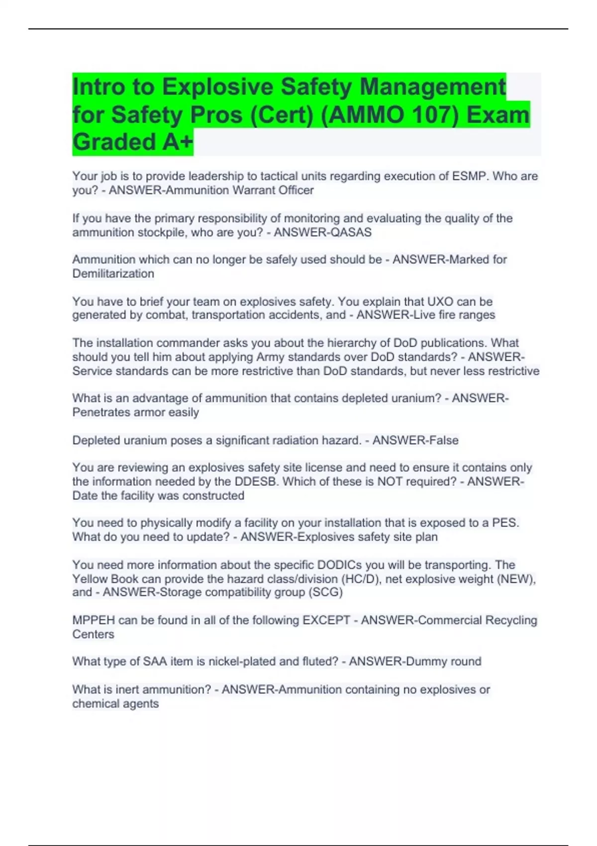 Your job is to provide leadership to tactical units regarding execution of ESMP. Who are you? - ANSWER-Ammunition Warrant Officer If you have the primary responsibility of monitoring and evaluating the quality of the ammunition stockpile, who are you? - ANSWER-QASAS Ammunition which can no longer be safely used should be - ANSWER-Marked for Demilitarization You have to brief your team on explosives safety. You explain that UXO can be generated by combat, transportation accidents, and - ANSWER-Live fire ranges The installation commander asks you about the hierarchy of DoD publications. What should you tell him about applying Army standards over DoD standards? - ANSWER-Service standards can be more restrictive than DoD standards, but never less restrictive What is an advantage of ammunition that contains depleted uranium? - ANSWER-Penetrates armor easily Depleted uranium poses a significant radiation hazard. - ANSWER-False You are reviewing an explosives safety site license and need to ensure it contains only the information needed by the DDESB. Which of these is NOT required? - ANSWER-Date the facility was constructed You need to physically modify a facility on your installation that is exposed to a PES. What do you need to update? - ANSWER-Explosives safety site plan You need more information about the specific DODICs you will be transporting. The Yellow Book can provide the hazard class/division (HC/D), net explosive weight (NEW), and - ANSWER-Storage compatibility group (SCG) MPPEH can be found in all of the following EXCEPT - ANSWER-Commercial Recycling Centers What type of SAA item is nickel-plated and fluted? - ANSWER-Dummy round What is inert ammunition? - ANSWER-Ammunition containing no explosives or chemical agents
