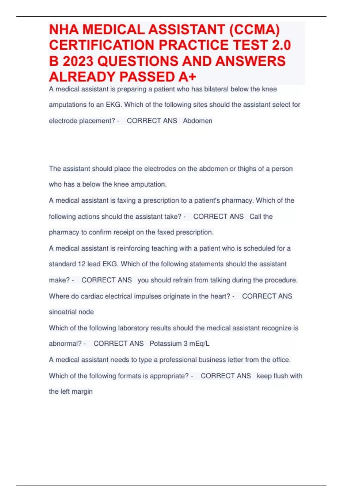 A medical assistant is preparing a patient who has bilateral below the knee amputations fo an EKG. Which of the following sites should the assistant select for electrode placement? - CORRECT ANS Abdomen The assistant should place the electrodes on the abdomen or thighs of a person who has a below the knee amputation. A medical assistant is faxing a prescription to a patient's pharmacy. Which of the following actions should the assistant take? - CORRECT ANS Call the pharmacy to confirm receipt on the faxed prescription. A medical assistant is reinforcing teaching with a patient who is scheduled for a standard 12 lead EKG. Which of the following statements should the assistant make? - CORRECT ANS you should refrain from talking during the procedure. Where do cardiac electrical impulses originate in the heart? - CORRECT ANS sinoatrial node Which of the following laboratory results should the medical assistant recognize is abnormal? - CORRECT ANS Potassium 3 mEq/L A medical assistant needs to type a professional business letter from the office. Which of the following formats is appropriate? - CORRECT ANS keep flush with the left margin A provider has requested a dissecting instrument on a sterile tray that a medical assistant is preparing. Which of the following instruments should the assistant include on the tray? - CORRECT ANS scissors A patient asks a medical assistant to explain the difference between a liniment an a medicated lotion. Which of the following responses should the assistant make? - CORRECT ANS Liniments contain higher portion of oil than medicated lotions. A medical assistant is cleaning an examination room after assisting a provider with a biopsy. Which of the following actions should the assistant take? - CORRECT ANS Hold sharps by the blunt end to avoid a needlestick injury. When coding with the ICD-10-CM, where should the medical assistant begin the process of looking up a diagnosis code for breast cancer? - CORRECT ANS The alphabetic Index Which of the following routes of administration should a medical assistant use when performing a tuberculin skin test? - CORRECT ANS Intradermal A medical assistant is responsible for cleaning the instruments used in a minor surgery. Which of the following is the first step in the process? - CORRECT ANS Sanitization A medical assistant is preforming an EKG on a patient. which of the following describes he appropriate placement of the electrodes? - CORRECT ANS Tabs downward on the arm A medical assistant is collecting vitals signs from a 6 year old child. The assistant should recognize that which of the following vital signs is outside of the expected reference range for this patient and should be reported to the provider? - CORRECT ANS Heart rate 140/min A medical assistant is reviewing a patient's medical history prior to the patient's appointment. Which of the following laboratory results indicates the need to schedule an extension of the current visit? - CORRECT ANS Fasting blood glucose 168mg/dL After a patient leaves an examination room, which of the following actions should a medical assistant take to prepare the examination table for the next patient? - CORRECT ANS Roll up the disposable paper on the table tightly and quickly. A medical assistant is assisting a provider with the repair of a laceration on a patients head. The providers prescription for the procedure includes an injection of 10 mL of lidocaine with epinephrine. The assistant should recognize that which of the following is the purpose of epinephrine in the local anesthetic? - CORRECT ANS To reduce bleeding at the site According to the regulation of controlled substances, which of the following is true of a schedule I drug? - CORRECT ANS Have no accepted medical use In which of the following scenarios should a medical assistant choose a CPT modifier? - CORRECT ANS For special circumstances applied to a procedure performed by the provider. When choosing a diagnosis code, a medical assistant should consider which of the following actions in order to avoid an insurance denial? - CORRECT ANS Coding to the highest level of specificity
