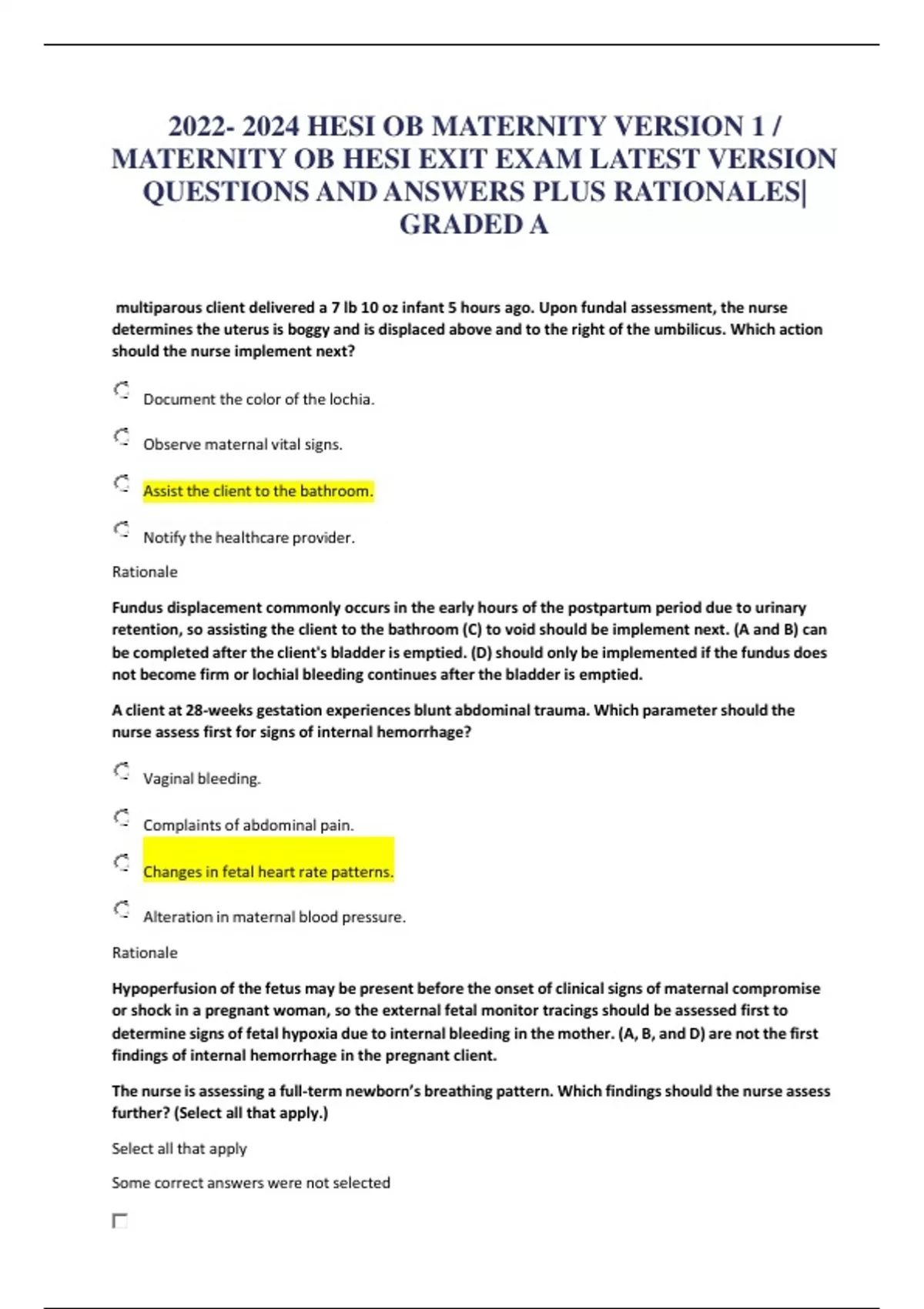 HESI OB MATERNITY VERSION 1 / MATERNITY OB HESI EXIT EXAM LATEST VERSION QUESTIONS AND ANSWERS PLUS RATIONALES| GRADED A