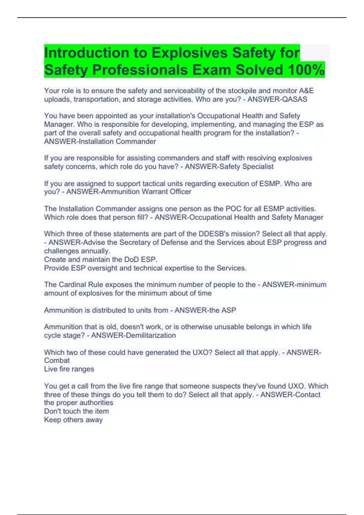 Your role is to ensure the safety and serviceability of the stockpile and monitor A&E uploads, transportation, and storage activities. Who are you? - ANSWER-QASAS You have been appointed as your installation's Occupational Health and Safety Manager. Who is responsible for developing, implementing, and managing the ESP as part of the overall safety and occupational health program for the installation? - ANSWER-Installation Commander If you are responsible for assisting commanders and staff with resolving explosives safety concerns, which role do you have? - ANSWER-Safety Specialist If you are assigned to support tactical units regarding execution of ESMP. Who are you? - ANSWER-Ammunition Warrant Officer The Installation Commander assigns one person as the POC for all ESMP activities. Which role does that person fill? - ANSWER-Occupational Health and Safety Manager Which three of these statements are part of the DDESB's mission? Select all that apply. - ANSWER-Advise the Secretary of Defense and the Services about ESP progress and challenges annually. Create and maintain the DoD ESP. Provide ESP oversight and technical expertise to the Services. The Cardinal Rule exposes the minimum number of people to the - ANSWER-minimum amount of explosives for the minimum about of time Ammunition is distributed to units from - ANSWER-the ASP Ammunition that is old, doesn't work, or is otherwise unusable belongs in which life cycle stage? - ANSWER-Demilitarization Which two of these could have generated the UXO? Select all that apply. - ANSWER-Combat Live fire ranges You get a call from the live fire range that someone suspects they've found UXO. Which three of these things do you tell them to do? Select all that apply. - ANSWER-Contact the proper authorities Don't touch the item Keep others away You are working on new explosives safety guidelines for the Army. What is the key principle you must remember when applying Service publication safety standards? - ANSWER-Service standards can be more restrictive, but never less restrictive than the DoD standard. Based on what you just learned about the different publications, where would you go to find the minimum level of protection all Services must provide for explosives safety? - ANSWER-DESR 6055.09 What is the primary hazard for HC 1.1? - ANSWER-Mass detonation Which placard must be attached to a load with a primary hazard of mass fire? - ANSWER-Explosives 1.3 1 Which placard indicates fragmentation as the primary hazard? - ANSWER-Explosives 1.2 1 Which placard must be displayed on a vehicle transporting a load of ammunition with a moderate risk of fire? - ANSWER-1.4 Explosives 1 What are four uses for DU - ANSWER-Aircraft counterweight Kinetic energy projectile Protective armor plating Radiation shielding material Which option shows the three hazards for DU in order from most hazardous to least hazardous? - ANSWER-Explosive, chemical, radiological If the quantity of explosives in a magazine exceeds the allowed safe storage limit (QD), what could cause the adjacent structures to explode as well? - ANSWER-Propogation Which ESQD term applies to Lil' T's? - ANSWER-PES Which three items are addressed in an ESSP? - ANSWER-Construction considerations Master plan reconciliation Quantity distance analysis Under which two circumstances would an ESSP be updated? - ANSWER-Increasing the explosive limit of an existing potential explosion site (PES) Planning a new explosives storage building for construction Which two load transportation violations are shown in the photo? - ANSWER-It is in the passenger compartment. It is not secure.