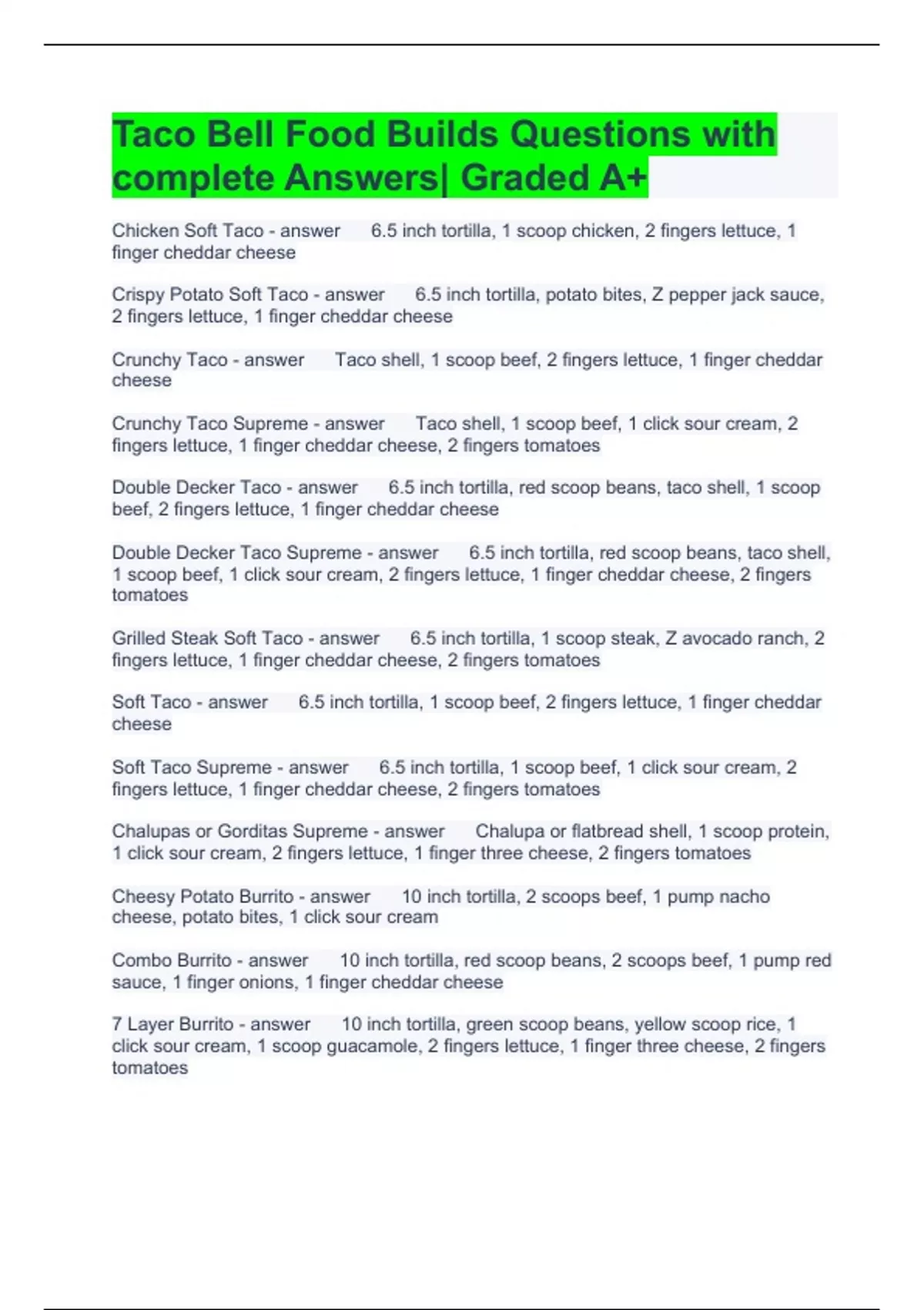 Taco Bell Food Builds Questions with complete Answers| Graded A+ Chicken Soft Taco 6.5 inch tortilla, 1 scoop chicken, 2 fingers lettuce, 1 finger cheddar cheese Crispy Potato Soft Taco 6.5 inch tortilla, potato bites, Z pepper jack sauce, 2 fingers lettuce, 1 finger cheddar cheese Crunchy Taco Taco shell, 1 scoop beef, 2 fingers lettuce, 1 finger cheddar cheese Crunchy Taco Supreme Taco shell, 1 scoop beef, 1 click sour cream, 2 fingers lettuce, 1 finger cheddar cheese, 2 fingers tomatoes Double Decker Taco 6.5 inch tortilla, red scoop beans, taco shell, 1 scoop beef, 2 fingers lettuce, 1 finger cheddar cheese Double Decker Taco Supreme 6.5 inch tortilla, red scoop beans, taco shell, 1 scoop beef, 1 click sour cream, 2 fingers lettuce, 1 finger cheddar cheese, 2 fingers tomatoes Grilled Steak Soft Taco 6.5 inch tortilla, 1 scoop steak, Z avocado ranch, 2 fingers lettuce, 1 finger cheddar cheese, 2 fingers tomatoes Soft Taco 6.5 inch tortilla, 1 scoop beef, 2 fingers lettuce, 1 finger cheddar cheese Soft Taco Supreme 6.5 inch tortilla, 1 scoop beef, 1 click sour cream, 2 fingers lettuce, 1 finger cheddar cheese, 2 fingers tomatoes Chalupas or Gorditas Supreme Chalupa or flatbread shell, 1 scoop protein, 1 click sour cream, 2 fingers lettuce, 1 finger three cheese, 2 fingers tomatoes Cheesy Potato Burrito 10 inch tortilla, 2 scoops beef, 1 pump nacho cheese, potato bites, 1 click sour cream Combo Burrito 10 inch tortilla, red scoop beans, 2 scoops beef, 1 pump red sauce, 1 finger onions, 1 finger cheddar cheese 7 Layer Burrito 10 inch tortilla, green scoop beans, yellow scoop rice, 1 click sour cream, 1 scoop guacamole, 2 fingers lettuce, 1 finger three cheese, 2 fingers tomatoes Bean Burrito 10 inch tortilla, green scoop beans, 1 pump red sauce, 1 finger onions, 1 finger cheddar cheese Beefy 5-Layer Burrito 10 inch tortilla, 1 pump nacho cheese, 6 inch tortilla, red scoop beans, 1 scoop beef, 1 click sour cream, 1 finger cheddar cheese Burrito Supreme 10 inch tortilla, red scoop beans, 1 scoop protein, 1 pump red sauce, 1 click sour cream, 1 finger onions, 2 fingers lettuce, 1 finger cheddar cheese, 2 fingers tomatoes Chicken Burrito 10 inch tortilla, 1 scoop rice, 1 scoop chicken, Z avocado ranch sauce, 1 finger cheddar cheese XXL Grilled Stuft Burrito 12 inch tortilla, red scoop beans, 1 scoop rice, 2 scoops protein, Z avocado ranch sauce, 1 click sour cream, 1 scoop guacamole, 1 scoop three cheese, 2 scoops pico de gallo, grilled Cheese Roll-Up 6.5 inch tortilla, 1 scoop three cheese, steamed Cheesy Fiesta Potatoes Potato bites, 1 pump nacho cheese, 1 click sour cream Cheesy Gordita Crunch Flatbread, 1 scoop three cheese, melted, taco shell, 1 scoop protein, Z spicy ranch, 2 fingers lettuce, 1 finger cheddar cheese Crunchwrap Supreme 12 inch tortilla, 1 scoop beef, 1 pump nacho cheese, tostada shell, 1 click sour cream, 2 fingers lettuce, 2 fingers tomatoes, grilled Enchirito 6.5 inch tortilla, red scoop beans, 1 scoop protein, 1 finger red strips, 1 finger cheddar cheese, 2 fingers tomatoes, 1 click sour cream, salsa on the side Mexican Pizza Mexican pizza shell, red scoop beans, 1 scoop beef, mexican pizza shell, 1 scoop pizza sauce, 1 scoop three cheese, 2 fingers tomatoes, melted Meximelt 6.5 inch tortilla, 1 scoop beef, 1 scoop pico de gallo, 1 scoop three cheese, melted Pintos 'N Cheese Green scoop beans, 1 pump red sauce, 1 finger three cheese Cheese Quesadilla 10 inch tortilla, Z creamy jalapeno, 2 scoops three cheese, steamed, grilled Chicken/Steak Quesadilla 10 inch tortilla, 1 scoop protein, Z creamy jalapeno, 2 scoops three cheese, steamed, grilled Tostada Tostada shell, green scoop beans, 1 pump red sauce, 2 fingers lettuce, 1 finger cheddar cheese Side of Rice 2 scoops rice Nachos Nachos in bag, 2 pumps nacho cheese on side Nachos BellGrande Nacho chips, green scoop beans, 1 scoop beef, 2 pumps nacho cheese, 1 click sour cream, 2 fingers tomatoes Nachos Supreme Nacho chips, red scoop beans, 1 scoop beef, 1 pump nacho cheese, 1 click sour cream, 2 fingers tomatoes Fiesta Taco Salad Taco shell bowl, 1 red scoop beans, 1 scoop rice, handful lettuce, 2 scoops protein, 2 fingers cheddar cheese, 2 fingers tomatoes, red strips, 1 click sour cream, salsa on side Black Bean Burrito 10 inch tortilla, 1 scoop rice, 1 scoop black beans, 1 pump red sauce, 2 fingers three cheese Side of Guacamole 2 scoops of guacamole Side of Pico de Gallo 2 scoops of pico de gallo