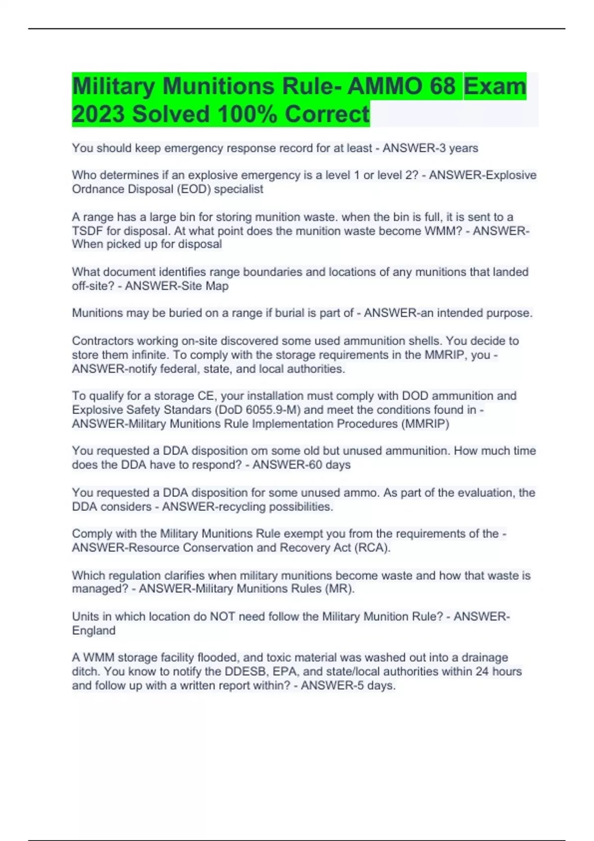 You should keep emergency response record for at least - ANSWER-3 years Who determines if an explosive emergency is a level 1 or level 2? - ANSWER-Explosive Ordnance Disposal (EOD) specialist A range has a large bin for storing munition waste. when the bin is full, it is sent to a TSDF for disposal. At what point does the munition waste become WMM? - ANSWER-When picked up for disposal What document identifies range boundaries and locations of any munitions that landed off-site? - ANSWER-Site Map Munitions may be buried on a range if burial is part of - ANSWER-an intended purpose. Contractors working on-site discovered some used ammunition shells. You decide to store them infinite. To comply with the storage requirements in the MMRIP, you - ANSWER-notify federal, state, and local authorities. To qualify for a storage CE, your installation must comply with DOD ammunition and Explosive Safety Standars (DoD 6055.9-M) and meet the conditions found in - ANSWER-Military Munitions Rule Implementation Procedures (MMRIP) You requested a DDA disposition om some old but unused ammunition. How much time does the DDA have to respond? - ANSWER-60 days You requested a DDA disposition for some unused ammo. As part of the evaluation, the DDA considers - ANSWER-recycling possibilities. Comply with the Military Munitions Rule exempt you from the requirements of the - ANSWER-Resource Conservation and Recovery Act (RCA). Which regulation clarifies when military munitions become waste and how that waste is managed? - ANSWER-Military Munitions Rules (MR). Units in which location do NOT need follow the Military Munition Rule? - ANSWER-England A WMM storage facility flooded, and toxic material was washed out into a drainage ditch. You know to notify the DDESB, EPA, and state/local authorities within 24 hours and follow up with a written report within? - ANSWER-5 days. Munitions on a range are not WMM until - ANSWER-picked up for treatment and disposal. You will spend several days firing test rockets on a range and collecting the used parts. By the end of each day, you have all the unused munitions lined up on the ground. Because testing is an intended purpose, the unused munitions are not considered waste and are exempt from the requirements of - ANSWER-RCRA. Your installation is expanding a range, and you have to update the operational range clearance (ORC) procedures. To ensure you include the most current range management and WMM requirements, you review Operational Range Clearance (DoDI 3200.16) and - ANSWER-Military Munitions Rule Implementation Procedures (MMRIP) During cleanup of an explosive emergency, you find some unused rounds. You know the rounds should be evaluated, sou you requested a disposition from the - ANSWER-Designed Disposition Authority (DDA). You are newly assigned explosive emergency responder at an installation. To be prepared, you should read the - ANSWER-Installation's emergency response plan. If your unit is located in California, you must manage WMM according to the Military Munitions Rule and - ANSWER-state and local laws. Unused munitions become waste military munitions (WMM) when - ANSWER-declared WMM by DDA. A truck pickup used munition for disposal off-post. The used munitions now become - ANSWER-waste military munitions. What is the purpose of the military munitions rule (MMR)? - ANSWER-to clarify when conventional and chemical military munitions become hazardous waste. MM that lands off-range are considered WMM if they - ANSWER-are not promptly rendered safe or retrieved Which of the following is WMM? - ANSWER-Munitions turned into Supply Point Amnesty Box Select all items that are considered as MM. - ANSWER-Chemical munitions and agents Explosives, pyrotechnics, chemical or riot control agents. Which group takes the lead role to declare, conduct, or terminate Level 1 emergencies? - ANSWER-EOD personnel In which regulation, pamphlet or standard would you locate hazardous WMM characteristics? - ANSWER-40 CFR, Part 261, Subpart C or D