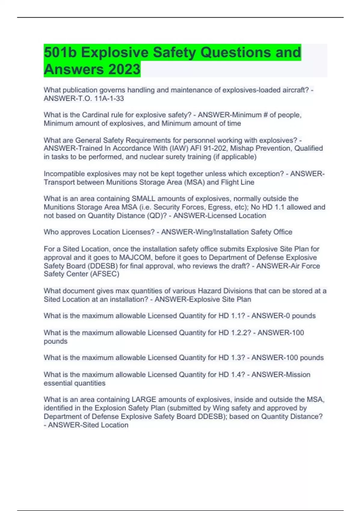 What publication governs handling and maintenance of explosives-loaded aircraft? - ANSWER-T.O. 11A-1-33 What is the Cardinal rule for explosive safety? - ANSWER-Minimum # of people, Minimum amount of explosives, and Minimum amount of time What are General Safety Requirements for personnel working with explosives? - ANSWER-Trained In Accordance With (IAW) AFI 91-202, Mishap Prevention, Qualified in tasks to be performed, and nuclear surety training (if applicable) Incompatible explosives may not be kept together unless which exception? - ANSWER-Transport between Munitions Storage Area (MSA) and Flight Line What is an area containing SMALL amounts of explosives, normally outside the Munitions Storage Area MSA (i.e. Security Forces, Egress, etc); No HD 1.1 allowed and not based on Quantity Distance (QD)? - ANSWER-Licensed Location Who approves Location Licenses? - ANSWER-Wing/Installation Safety Office For a Sited Location, once the installation safety office submits Explosive Site Plan for approval and it goes to MAJCOM, before it goes to Department of Defense Explosive Safety Board (DDESB) for final approval, who reviews the draft? - ANSWER-Air Force Safety Center (AFSEC) What document gives max quantities of various Hazard Divisions that can be stored at a Sited Location at an installation? - ANSWER-Explosive Site Plan What is the maximum allowable Licensed Quantity for HD 1.1? - ANSWER-0 pounds What is the maximum allowable Licensed Quantity for HD 1.2.2? - ANSWER-100 pounds What is the maximum allowable Licensed Quantity for HD 1.3? - ANSWER-100 pounds What is the maximum allowable Licensed Quantity for HD 1.4? - ANSWER-Mission essential quantities What is an area containing LARGE amounts of explosives, inside and outside the MSA, identified in the Explosion Safety Plan (submitted by Wing safety and approved by Department of Defense Explosive Safety Board DDESB); based on Quantity Distance? - ANSWER-Sited Location