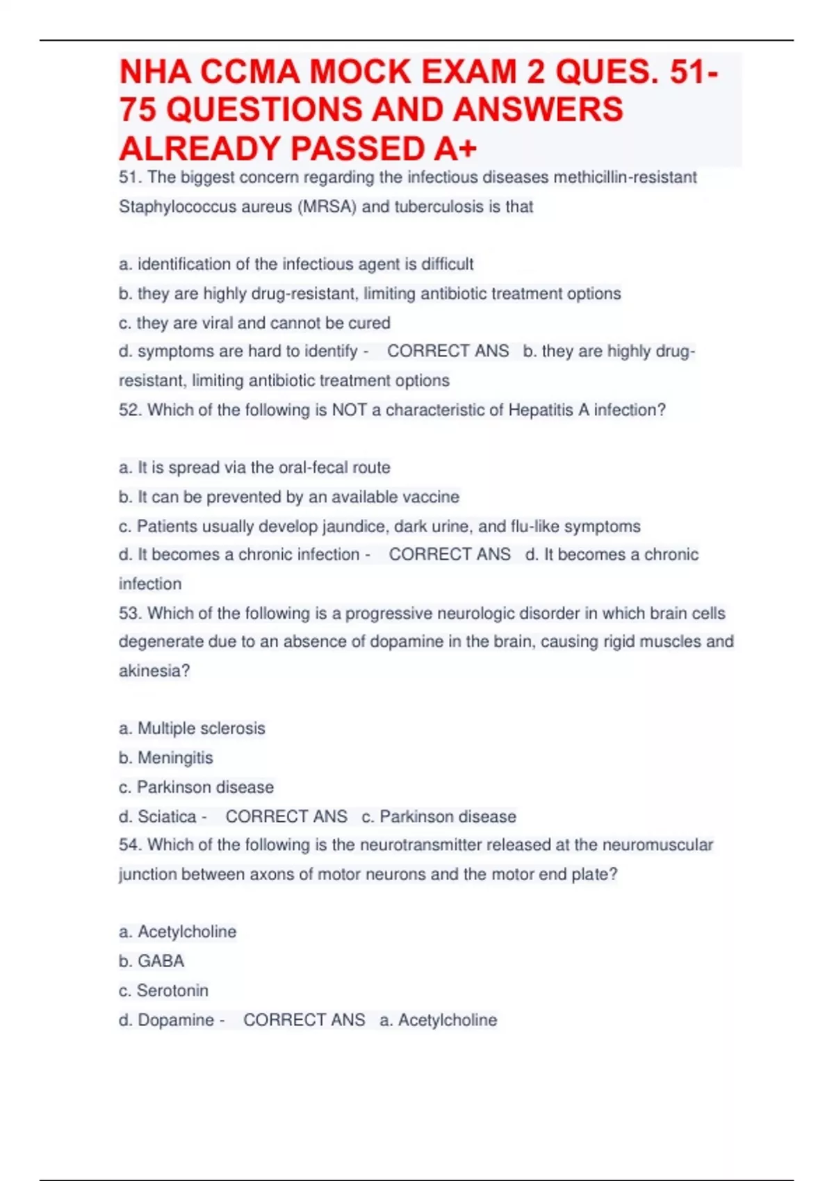 51. The biggest concern regarding the infectious diseases methicillin-resistant Staphylococcus aureus (MRSA) and tuberculosis is that a. identification of the infectious agent is difficult b. they are highly drug-resistant, limiting antibiotic treatment options c. they are viral and cannot be cured d. symptoms are hard to identify - CORRECT ANS b. they are highly drug-resistant, limiting antibiotic treatment options 52. Which of the following is NOT a characteristic of Hepatitis A infection? a. It is spread via the oral-fecal route b. It can be prevented by an available vaccine c. Patients usually develop jaundice, dark urine, and flu-like symptoms d. It becomes a chronic infection - CORRECT ANS d. It becomes a chronic infection 53. Which of the following is a progressive neurologic disorder in which brain cells degenerate due to an absence of dopamine in the brain, causing rigid muscles and akinesia? a. Multiple sclerosis b. Meningitis c. Parkinson disease d. Sciatica - CORRECT ANS c. Parkinson disease 54. Which of the following is the neurotransmitter released at the neuromuscular junction between axons of motor neurons and the motor end plate? a. Acetylcholine b. GABA c. Serotonin d. Dopamine - CORRECT ANS a. Acetylcholine 55. A streptococcal infection might be linked to all of the following circulatory disorders, EXCEPT a. rheumatic fever b. mitral valve stenosis c. congestive heart failure d. varicose veins - CORRECT ANS d.