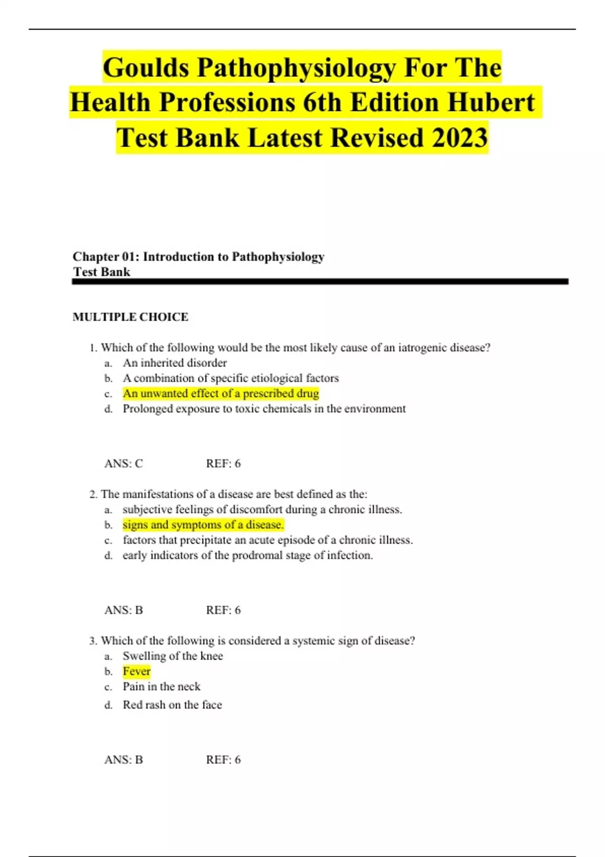 Goulds Pathophysiology For The Health Professions 6th Edition Hubert Test Bank Latest Revised 2023/2024 .Which of the following would be the most likely cause of an iatrogenic disease? 2.The manifestations of a disease are best defined as the: 3.Which of the following is considered a systemic sign of disease? 4.The best definition of the term prognosis is the: