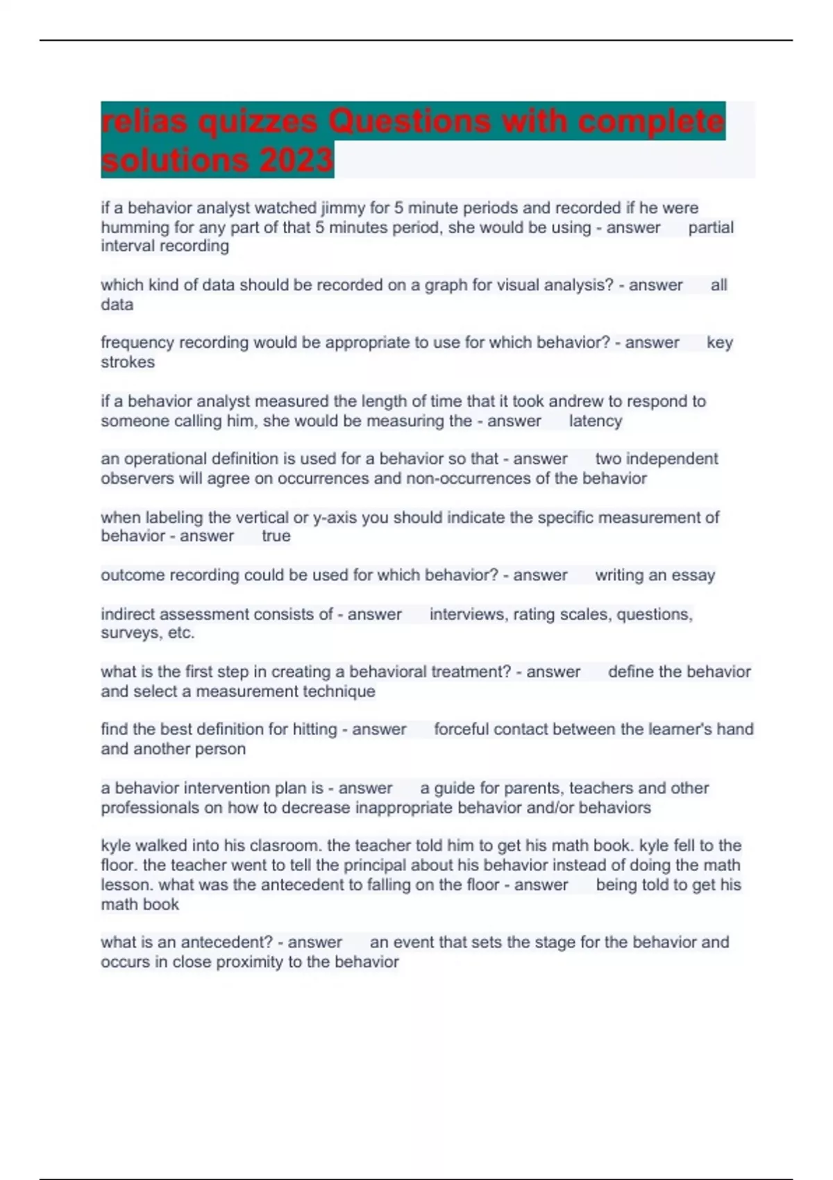 relias quizzes Questions with complete solutions 2023 if a behavior analyst watched jimmy for 5 minute periods and recorded if he were humming for any part of that 5 minutes period, she would be using partial interval recording which kind of data should be recorded on a graph for visual analysis? all data frequency recording would be appropriate to use for which behavior? key strokes if a behavior analyst measured the length of time that it took andrew to respond to someone calling him, she would be measuring the latency an operational definition is used for a behavior so that two independent observers will agree on occurrences and non-occurrences of the behavior when labeling the vertical or y-axis you should indicate the specific measurement of behavior true outcome recording could be used for which behavior? writing an essay indirect assessment consists of interviews, rating scales, questions, surveys, etc. what is the first step in creating a behavioral treatment? define the behavior and select a measurement technique find the best definition for hitting forceful contact between the learner's hand and another person a behavior intervention plan is a guide for parents, teachers and other professionals on how to decrease inappropriate behavior and/or behaviors kyle walked into his clasroom. the teacher told him to get his math book. kyle fell to the floor. the teacher went to tell the principal about his behavior instead of doing the math lesson. what was the antecedent to falling on the floor being told to get his math book what is an antecedent? an event that sets the stage for the behavior and occurs in close proximity to the behavior topography is the same as form; what the behavior looks like before you can make a hypothesis about the function(s) of the target behavior, you must do all of the following except tell the parents to skip medication for a day so you can rule out medication effects in a real observation, it is important to do which of the following? record several instances of the behavior in several settings which of the following could be a Motivating Operation? Tommy hasn't eaten today and is very hungry what situation might warrant a functional assessment of problem behavior and a behavior intervention plan? candace throws items at her peers during class. this happens several times/hour which of the following is not socially mediated? automatic reinforcement the function of a behavior can change based on setting and people present an important ethical question to ask yourself when setting up a behavior change program is how will this benefit the individual? which of the following behaviors is observable and allows for data collection? hitting with open hand what are the 4 functions of behavior? access to tangibles, to gain attention, escape, automatic behavioral definitions must be both observable and measurable to maintain organization, what choices should you give yourself for every piece of paper you receive or generate? throw it away, route it to someone else, act on it now or file it and put it on your master to-do list what is not appropriate to document in a communication log book? comments critical of others what are two of the highest priorities in record keeping when providing services to people with disabilities? the person's preferences, and communication between coworkers what are the five rules of incident report writing? write for an audience, account for everyone and everything, be clear and chronological, be timely and complete, consider the attachments what are three things that work together to ensure the person is living a life that reflects their needs and desires? the service plan, your support of the person based on this plan and the documentation of your support maintaining accurate documentation while dependably providing excellent services requires what from you? good judgement to strike a balance what are two things you need to maintain if you assist a person with banking and bill paying? a transaction record and a reconciliation of the transaction complete this sentence; Documentation and record keeping are important to ensure accountability, coordination of care between yourself and other supports and to guide the improvement of services what are two reasons that documentation is beneficial? more complete communication in emergencies, and more accurate assessments, will improve services to the person good record keeping assures that the team is not making decisions based on random impressions but on what? valid information what is the purpose of writing and reviewing accurate and complete incident reports? to prevent recurrences of that incident your documentation, when reviewed, will help to assure the person is receiving comprehensive services what is purpose of the communication log? to inform other supporters of daily events they need to know in order to provide a continuity of quality care what are two things you can do to organize and prepare for each day ahead of time? use a to-do list and keep a calendar to review what is up ahead high quality documentation is important because it can result in which of these outcomes? a full and safe life for the person served in addition to having knowledge of the service plan what are your responsibilities related to it? to provide and document the services you give to the person as outlined in the plan what can your documentation related to a person's health screenings help to ensure? that they are receiving the health screenings that are recommended for their sex, age, and medical conditions when you document you should attempt to document only what was observed, not interpretations of what was observed what is one thing you can do while you are working to remember details or events you will document later? carry a note pad around when working to jot down notes to transcribe later what is one thing you can do to maximize accuracy of what you document when assessing a person? document immedia