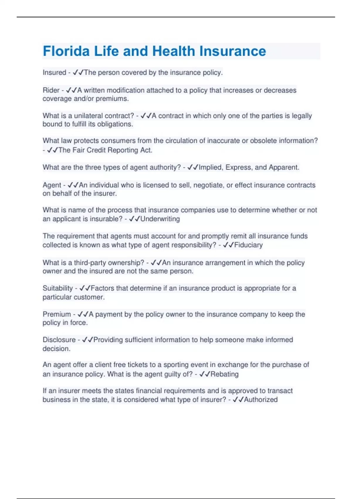 Insured - The person covered by the insurance policy. Rider - A written modification attached to a policy that increases or decreases coverage and/or premiums. What is a unilateral contract? - A contract in which only one of the parties is legally bound to fulfill its obligations. What law protects consumers from the circulation of inaccurate or obsolete information? - The Fair Credit Reporting Act. What are the three types of agent authority? - Implied, Express, and Apparent. Agent - An individual who is licensed to sell, negotiate, or effect insurance contracts on behalf of the insurer. What is name of the process that insurance companies use to determine whether or not an applicant is insurable? - Underwriting The requirement that agents must account for and promptly remit all insurance funds collected is known as what type of agent responsibility? - Fiduciary What is a third-party ownership? - An insurance arrangement in which the policy owner and the insured are not the same person. Suitability - Factors that determine if an insurance product is appropriate for a particular customer. Premium - A payment by the policy owner to the insurance company to keep the policy in force. Disclosure - Providing sufficient information to help someone make informed decision. An agent offer a client free tickets to a sporting event in exchange for the purchase of an insurance policy. What is the agent guilty of? - Rebating If an insurer meets the states financial requirements and is approved to transact business in the state, it is considered what type of insurer? - Authorized