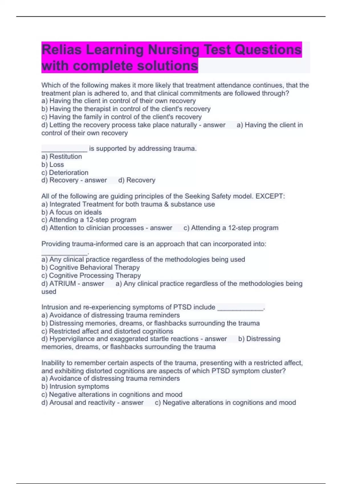 Relias Learning Nursing Test Questions with complete solutions Which of the following makes it more likely that treatment attendance continues, that the treatment plan is adhered to, and that clinical commitments are followed through? a) Having the client in control of their own recovery b) Having the therapist in control of the client's recovery c) Having the family in control of the client's recovery d) Letting the recovery process take place naturally a) Having the client in control of their own recovery ____________ is supported by addressing trauma. a) Restitution b) Loss c) Deterioration d) Recovery d) Recovery All of the following are guiding principles of the Seeking Safety model. EXCEPT: a) Integrated Treatment for both trauma & substance use b) A focus on ideals c) Attending a 12-step program d) Attention to clinician processes c) Attending a 12-step program Providing trauma-informed care is an approach that can incorporated into: ____________. a) Any clinical practice regardless of the methodologies being used b) Cognitive Behavioral Therapy c) Cognitive Processing Therapy d) ATRIUM a) Any clinical practice regardless of the methodologies being used Intrusion and re-experiencing symptoms of PTSD include ____________. a) Avoidance of distressing trauma reminders b) Distressing memories, dreams, or flashbacks surrounding the trauma c) Restricted affect and distorted cognitions d) Hypervigilance and exaggerated startle reactions b) Distressing memories, dreams, or flashbacks surrounding the trauma Inability to remember certain aspects of the trauma, presenting with a restricted affect, and exhibiting distorted cognitions are aspects of which PTSD symptom cluster? a) Avoidance of distressing trauma reminders b) Intrusion symptoms c) Negative alterations in cognitions and mood d) Arousal and reactivity c) Negative alterations in cognitions and mood When is it most important that the person served feels that the environment is a safe place where they can discuss details of their trauma? a) In outpatient settings b) In residential treatment facilities c) In and inpatient setting d) In all settings d) In all settings One of the primary goals for treatment in the Seeking Safety model is: a) Stopping self-harm b) Ending substance use once and for all c) Gaining control over minor symptoms d) Maintaining relationships a) Stopping self-harm True or False: If a person develops resiliency through their childhood and life experiences, the effect of any genetic risks for substance use disorder are greatly increased. a) True b) False b) False True or False: Trauma increases the the risk of developing substance use problems, while substance use problems increase the likelihood that people will experience trauma. a) True b) False a) True Repeated use of substances trains the brain's circuits to depend on substances to trigger ____________. a) False positives b) False negatives c) Reward circuitry d) Biofeedback c) Reward circuitry True or False: Those who had experienced traumatic physical or sexual abuse, or assault, were three times more likely to report substance use disorder than those without trauma. a) True b) False a) True Motivational interviewing is an opportunity for: a) The therapist to assess for themselves if the benefits of using a specific therapeutic approach b) Clients to assess for themselves the benefits of their specific choices c) Self-improvement as it relates to substance use disorders d) Self-improvement as it relates to posttraumatic stress disorder b) Clients to assess for themselves the benefits of their specific choice Which of the following is essential in any formal treatment setting for bringing hope, encouragement, and clinical skill to the interaction? a) Believing that people can and do recover from mental illnesses like anxiety, traumatic stress, and substance use b) Telling clients that you believe in their recovery even if you don't c) Level of education and formal training that you offer d) Offering communication surrounding cultural norms and expectations about recovery, along with where they can strengthen their skills to meet these expectations a) Believing that people can and do recover from mental illnesses like anxiety, traumatic stress, and substance use To understand an individual's response to life stressors by misusing substances, becoming preoccupied, and persisting in their use despite increasing consequences, be sure to assess any underlying a) Financial hardships b) Employment problems c) Biopsychosocial factors d) Health problems c) Biopsychosocial factors Assessing for substance use disorder ideally should include all of the following, EXCEPT: a) Initial screening for drugs and alcohol b) Potentially threatening, intrusive questions that ask the difficult questions about personal habits c) Screening for behavioral health problems d) Screening for cognitive functioning b) Potentially threatening, intrusive questions that ask the difficult questions about personal habits One of the first principles of trauma-informed care is understanding ____________. a) Clinical practice principles b) Trauma's widespread prevalence c) Which methodologies to use d) Relapse and recovery b) Trauma's widespread prevalence