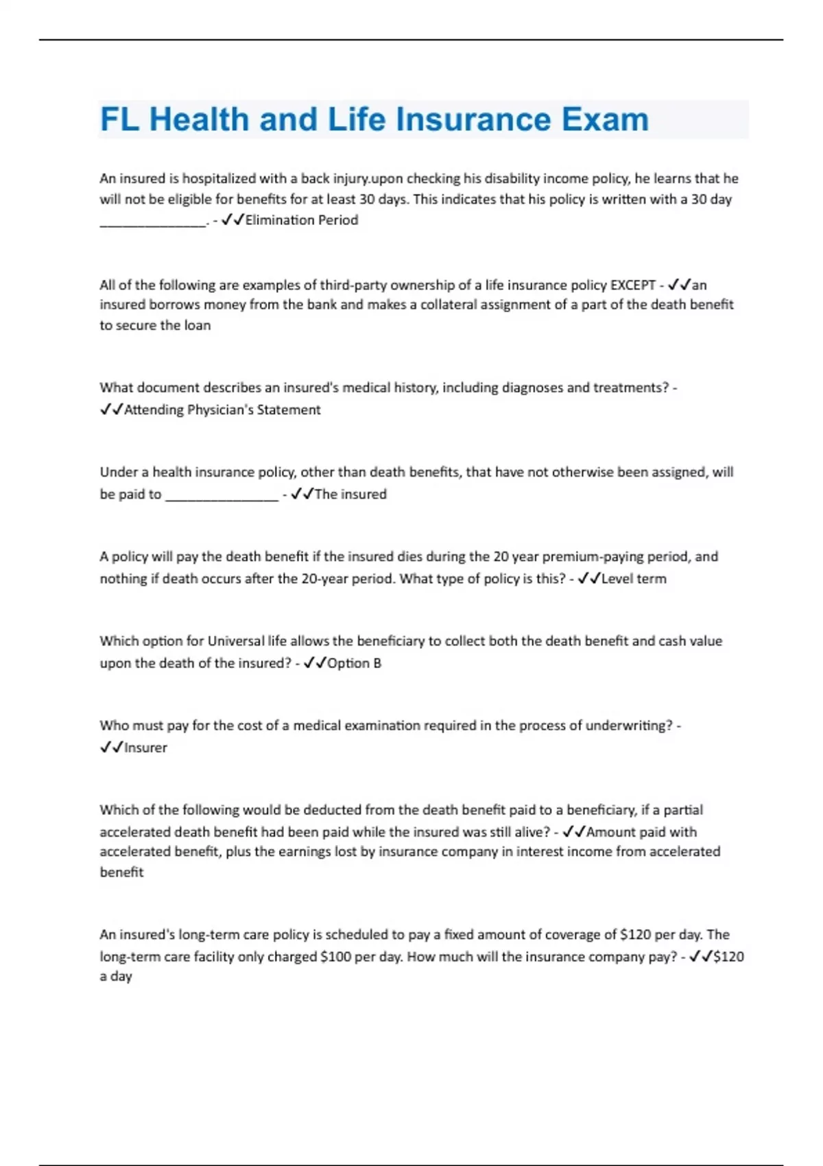 An insured is hospitalized with a back checking his disability income policy, he learns that he will not be eligible for benefits for at least 30 days. This indicates that his policy is written with a 30 day ______________. - Elimination Period All of the following are examples of third-party ownership of a life insurance policy EXCEPT - an insured borrows money from the bank and makes a collateral assignment of a part of the death benefit to secure the loan What document describes an insured's medical history, including diagnoses and treatments? - Attending Physician's Statement Under a health insurance policy, other than death benefits, that have not otherwise been assigned, will be paid to _______________ - The insured A policy will pay the death benefit if the insured dies during the 20 year premium-paying period, and nothing if death occurs after the 20-year period. What type of policy is this? - Level term Which option for Universal life allows the beneficiary to collect both the death benefit and cash value upon the death of the insured? - Option B Who must pay for the cost of a medical examination required in the process of underwriting? - Insurer Which of the following would be deducted from the death benefit paid to a beneficiary, if a partial accelerated death benefit had been paid while the insured was still alive? - Amount paid with accelerated benefit, plus the earnings lost by insurance company in interest income from accelerated benefit An insured's long-term care policy is scheduled to pay a fixed amount of coverage of $120 per day. The long-term care facility only charged $100 per day. How much will the insurance company pay? - $120 a day