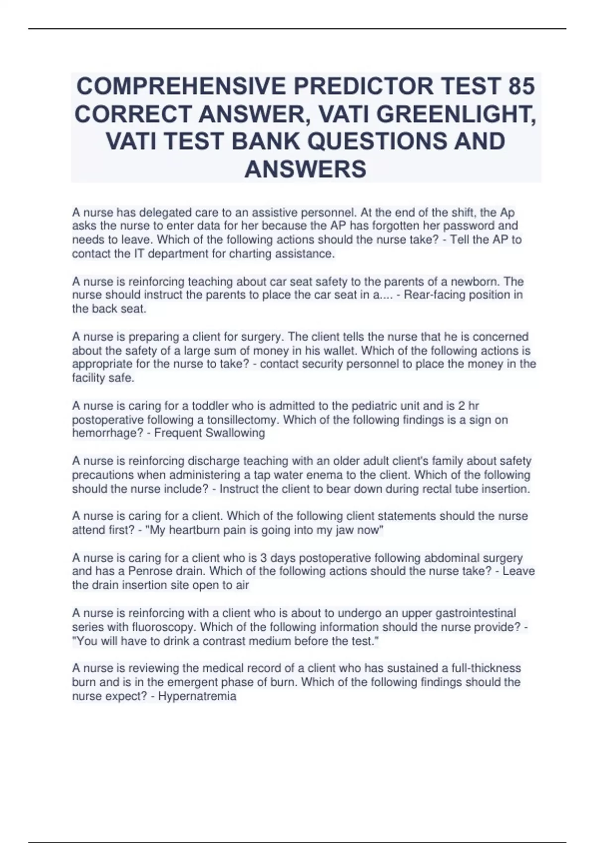 COMPREHENSIVE PREDICTOR TEST 85 CORRECT ANSWER, VATI GREENLIGHT, VATI TEST BANK QUESTIONS AND ANSWERS A nurse has delegated care to an assistive personnel. At the end of the shift, the Ap asks the nurse to enter data for her because the AP has forgotten her password and needs to leave. Which of the following actions should the nurse take? A nurse is reinforcing teaching about car seat safety to the parents of a newborn. The nurse should instruct the parents to place the car seat in a.... A nurse is preparing a client for surgery. The client tells the nurse that he is concerned about the safety of a large sum of money in his wallet. Which of the following actions is appropriate for the nurse to take? A nurse is caring for a toddler who is admitted to the pediatric unit and is 2 hr postoperative following a tonsillectomy. Which of the following findings is a sign on hemorrhage? A nurse is reinforcing discharge teaching with an older adult client's family about safety precautions when administering a tap water enema to the client. Which of the following should the nurse include? A nurse is caring for a client. Which of the following client statements should the nurse attend first? A nurse is caring for a client who is 3 days postoperative following abdominal surgery and has a Penrose drain. Which of the following actions should the nurse take?