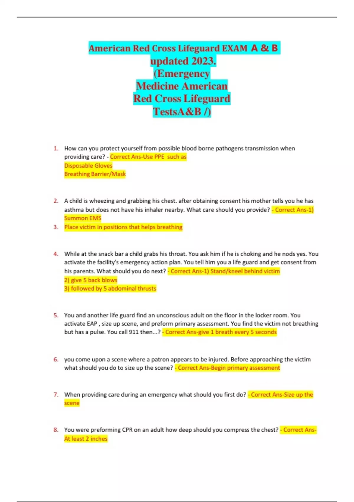 American Red Cross Lifeguard EXAM A & B updated 2023. (Emergency Medicine American Red Cross Lifeguard TestsA&B /)