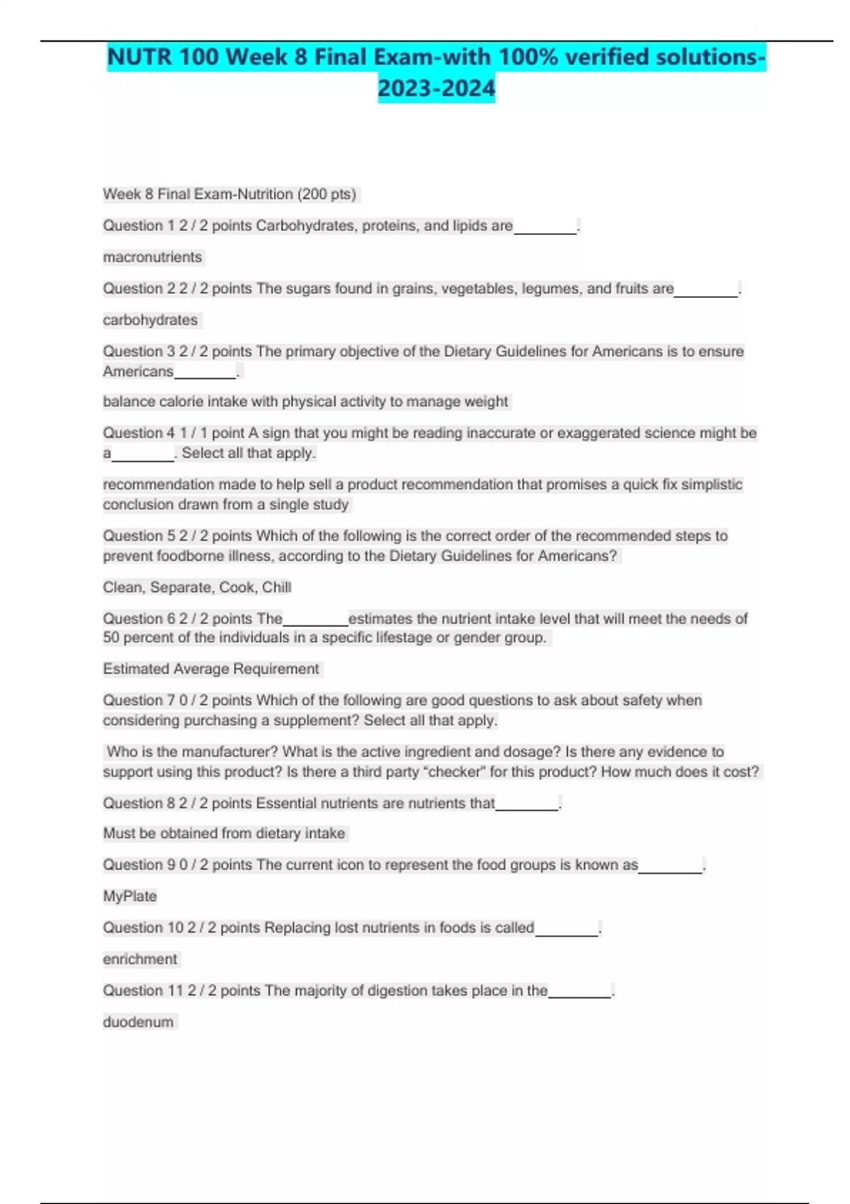 NUTR 100 Week 8 Final Exam-with 100% verified solutions-