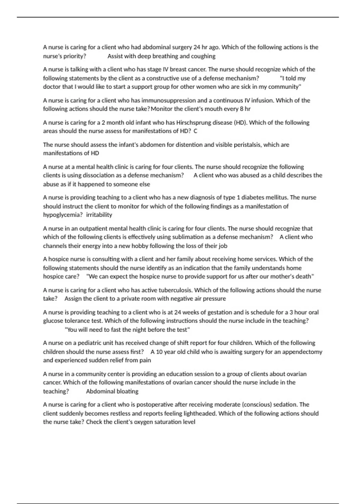 A nurse is caring for a client who had abdominal surgery 24 hr ago. Which of the following actions is the nurse's priority? Assist with deep breathing and coughing A nurse is talking with a client who has stage IV breast cancer. The nurse should recognize which of the following statements by the client as a constructive use of a defense mechanism? "I told my doctor that I would like to start a support group for other women who are sick in my community" A nurse is caring for a client who has immunosuppression and a continuous IV infusion. Which of the following actions should the nurse take?Monitor the client's mouth every 8 hr A nurse is caring for a 2 month old infant who has Hirschsprung disease (HD). Which of the following areas should the nurse assess for manifestations of HD? C The nurse should assess the infant's abdomen for distention and visible peristalsis, which are manifestations of HD A nurse at a mental health clinic is caring for four clients. The nurse should recognize the following clients is using dissociation as a defense mechanism? A client who was abused as a child describes the abuse as if it happened to someone else A nurse is providing teaching to a client who has a new diagnosis of type 1 diabetes mellitus. The nurse should instruct the client to monitor for which of the following findings as a manifestation of hypoglycemia? irritability A nurse in an outpatient mental health clinic is caring for four clients. The nurse should recognize that which of the following clients is effectively using sublimation as a defense mechanism? A client who channels their energy into a new hobby following the loss of their job A hospice nurse is consulting with a client and her family about receiving home services. Which of the following statements should the nurse identify as an indication that the family understands home hospice care? "We can expect the hospice nurse to provide support for us after our mother's death" A nurse is caring for a client who has active tuberculosis. Which of the following actions should the nurse take? Assign the client to a private room with negative air pressure A nurse is providing teaching to a client who is at 24 weeks of gestation and is schedule for a 3 hour oral glucose tolerance test. Which of the following instructions should the nurse include in the teaching? "You will need to fast the night before the test" A nurse on a pediatric unit has received change of shift report for four children. Which of the following children should the nurse assess first? A 10 year old child who is awaiting surgery for an appendectomy and experienced sudden relief from pain A nurse in a community center is providing an education session to a group of clients about ovarian cancer. Which of the following manifestations of ovarian cancer should the nurse include in the teaching? Abdominal bloating