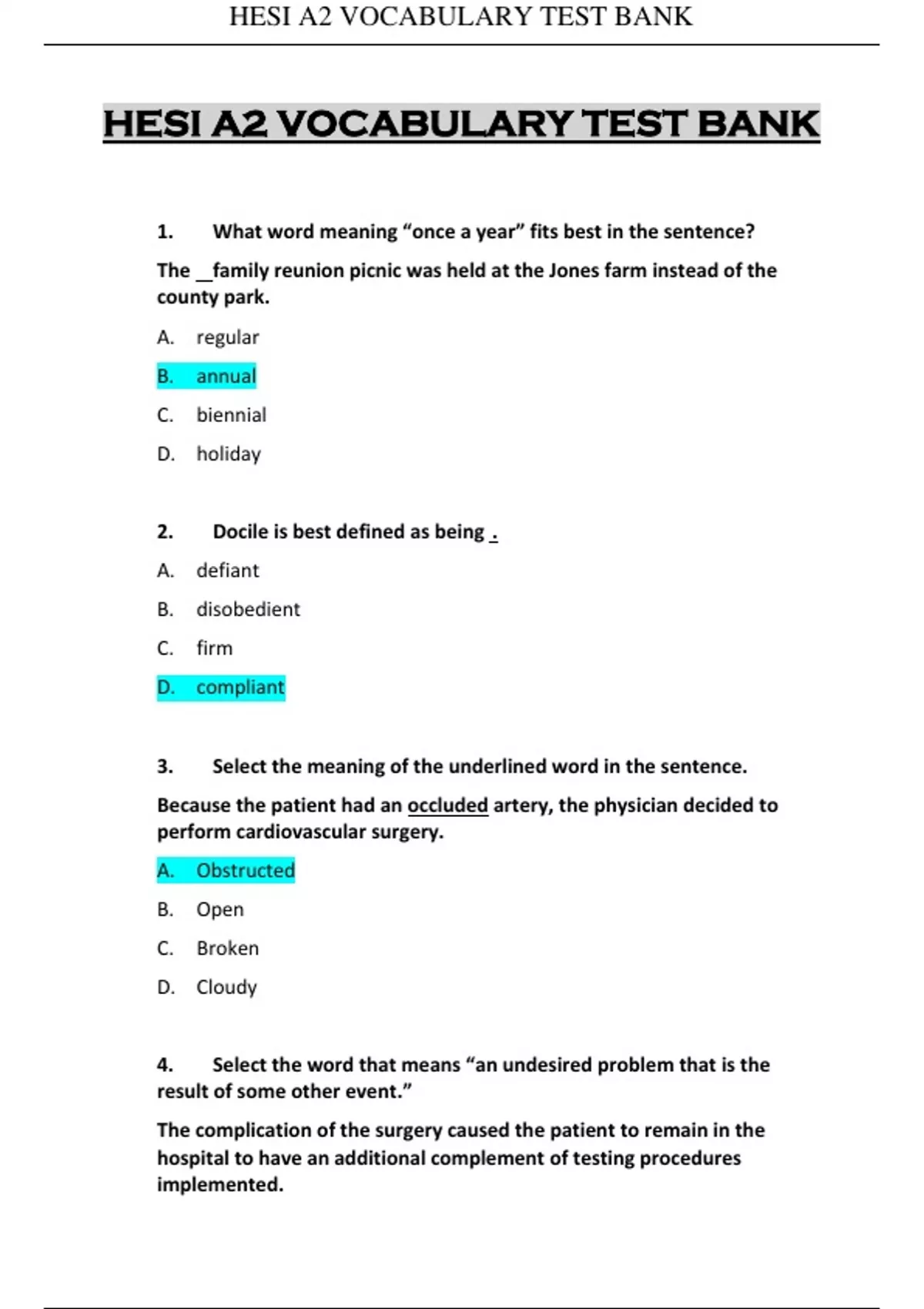 HESI A2 VOCABULARY TEST BANK/HESI A2 VOCABULARY TEST BANK/HESI A2 VOCABULARY TEST BANK
