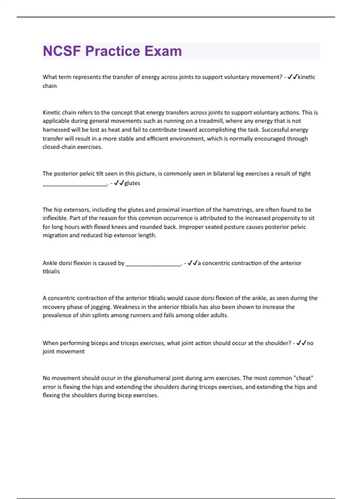 What term represents the transfer of energy across joints to support voluntary movement? - kinetic chain Kinetic chain refers to the concept that energy transfers across joints to support voluntary actions. This is applicable during general movements such as running on a treadmill, where any energy that is not harnessed will be lost as heat and fail to contribute toward accomplishing the task. Successful energy transfer will result in a more stable and efficient environment, which is normally encouraged through closed-chain exercises. The posterior pelvic tilt seen in this picture, is commonly seen in bilateral leg exercises a result of tight ____________________. - glutes The hip extensors, including the glutes and proximal insertion of the hamstrings, are often found to be inflexible. Part of the reason for this common occurrence is attributed to the increased propensity to sit for long hours with flexed knees and rounded back. Improper seated posture causes posterior pelvic migration and reduced hip extensor length. Ankle dorsi flexion is caused by _________________. - a concentric contraction of the anterior tibialis A concentric contraction of the anterior tibialis would cause dorsi flexion of the ankle, as seen during the recovery phase of jogging. Weakness in the anterior tibialis has also been shown to increase the prevalence of shin splints among runners and falls among older adults. When performing biceps and triceps exercises, what joint action should occur at the shoulder? - no joint movement No movement should occur in the glenohumeral joint during arm exercises. The most common "cheat" error is flexing the hips and extending the shoulders during triceps exercises, and extending the hips and flexing the shoulders during bicep exercises.What exercise is used to cause elevation of the shoulder complex (scapulae and humerus)? - barbell shrug