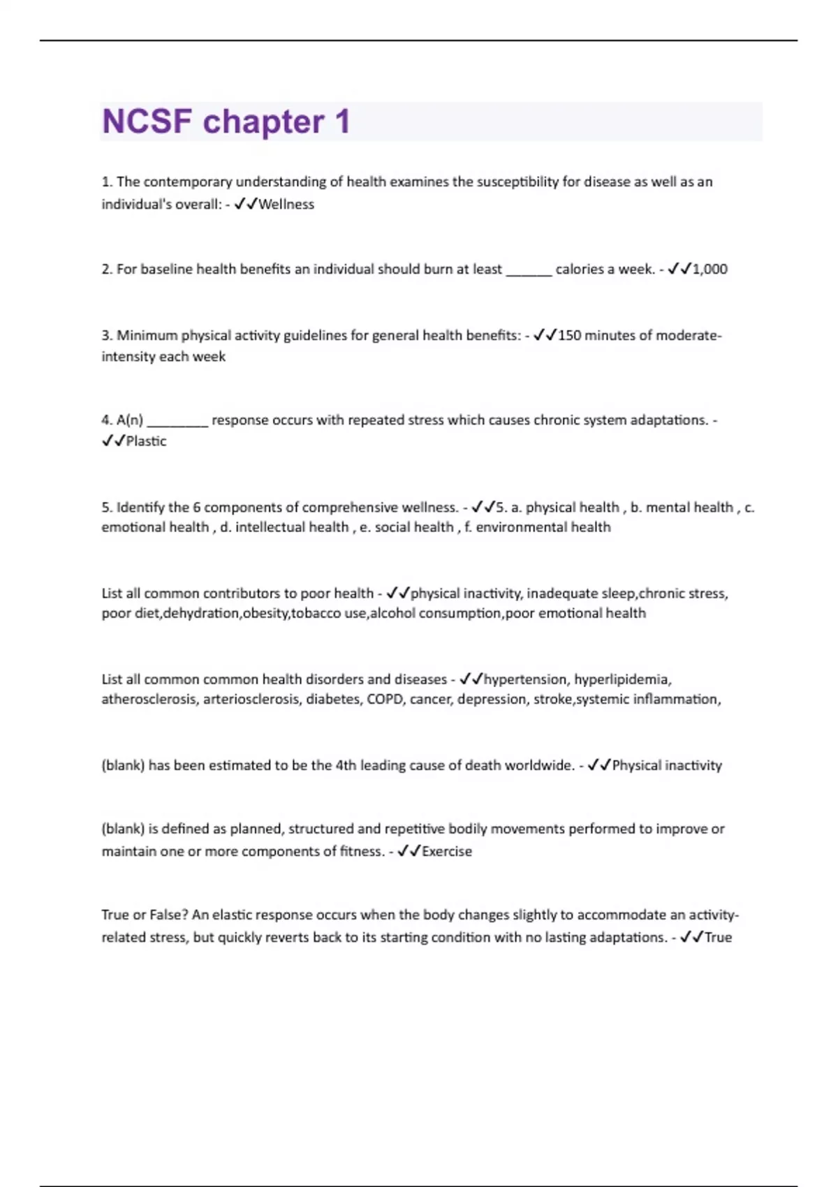 1. The contemporary understanding of health examines the susceptibility for disease as well as an individual's overall: - Wellness 2. For baseline health benefits an individual should burn at least ______ calories a week. - 1,000 3. Minimum physical activity guidelines for general health benefits: - 150 minutes of moderateintensity each week 4. A(n) ________ response occurs with repeated stress which causes chronic system adaptations. - Plastic 5. Identify the 6 components of comprehensive wellness. - 5. a. physical health , b. mental health , c. emotional health , d. intellectual health , e. social health , f. environmental health List all common contributors to poor health - physical inactivity, inadequate sleep,chronic stress, poor diet,dehydration,obesity,tobacco use,alcohol consumption,poor emotional health List all common common health disorders and diseases - hypertension, hyperlipidemia, atherosclerosis, arteriosclerosis, diabetes, COPD, cancer, depression, stroke,systemic inflammation, (blank) has been estimated to be the 4th leading cause of death worldwide. - Physical inactivity (blank) is defined as planned, structured and repetitive bodily movements performed to improve or maintain one or more components of fitness. - Exercise True or False? An elastic response occurs when the body changes slightly to accommodate an activityrelated stress, but quickly reverts back to its starting condition with no lasting adaptations. - True