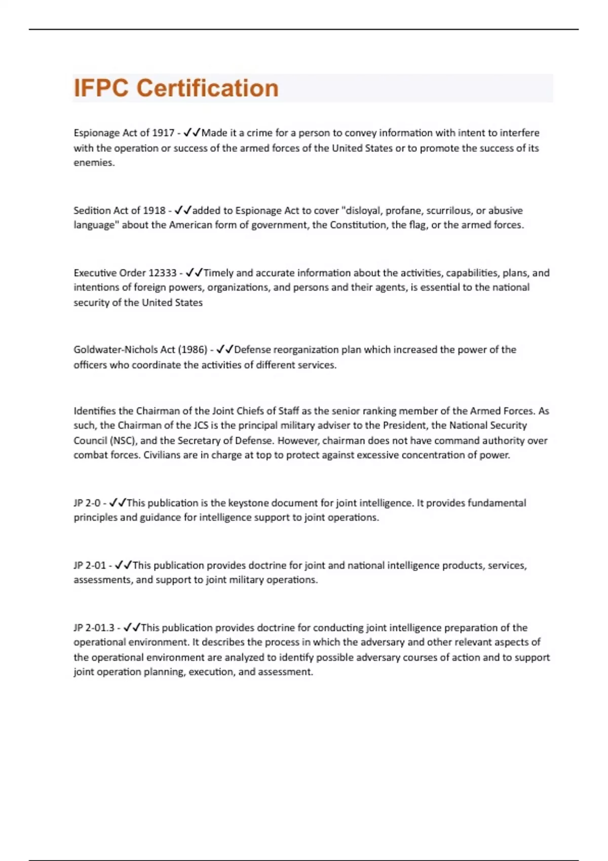 Espionage Act of 1917 - Made it a crime for a person to convey information with intent to interfere with the operation or success of the armed forces of the United States or to promote the success of its enemies. Sedition Act of 1918 - added to Espionage Act to cover "disloyal, profane, scurrilous, or abusive language" about the American form of government, the Constitution, the flag, or the armed forces. Executive Order 12333 - Timely and accurate information about the activities, capabilities, plans, and intentions of foreign powers, organizations, and persons and their agents, is essential to the national security of the United States Goldwater-Nichols Act (1986) - Defense reorganization plan which increased the power of the officers who coordinate the activities of different services. Identifies the Chairman of the Joint Chiefs of Staff as the senior ranking member of the Armed Forces. As such, the Chairman of the JCS is the principal military adviser to the President, the National Security Council (NSC), and the Secretary of Defense. However, chairman does not have command authority over combat forces. Civilians are in charge at top to protect against excessive concentration of power. JP 2-0 - This publication is the keystone document for joint intelligence. It provides fundamental principles and guidance for intelligence support to joint operations. JP 2-01 - This publication provides doctrine for joint and national intelligence products, services, assessments, and support to joint military operations. JP 2-01.3 - This publication provides doctrine for conducting joint intelligence preparation of the operational environment. It describes the process in which the adversary and other relevant aspects of the operational environment are analyzed to identify possible adversary courses of action and to support joint operation planning, execution, and assessment.JP 2-03 - This publication provides doctrine for conducting geospatial intelligence (GEOINT) across the range of military operations.