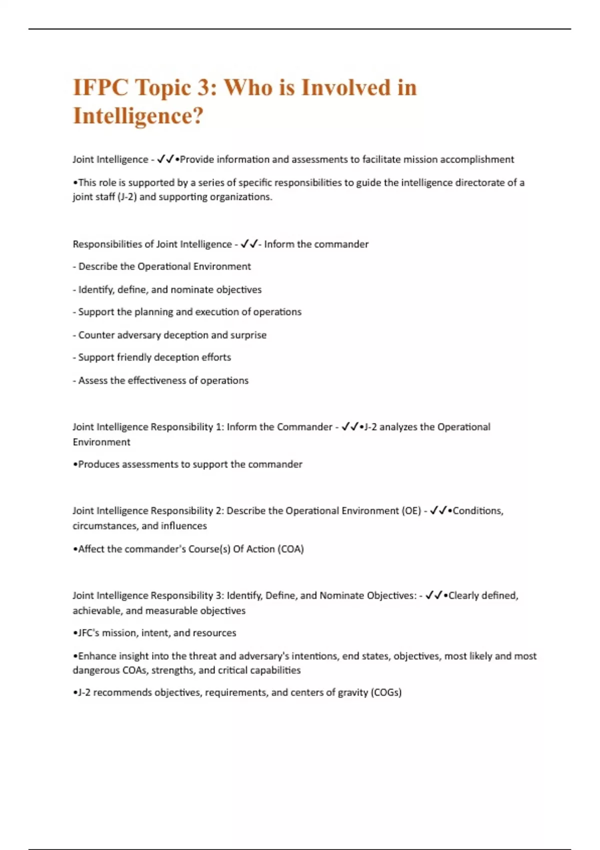 Joint Intelligence - •Provide information and assessments to facilitate mission accomplishment •This role is supported by a series of specific responsibilities to guide the intelligence directorate of a joint staff (J-2) and supporting organizations. Responsibilities of Joint Intelligence - - Inform the commander - Describe the Operational Environment - Identify, define, and nominate objectives - Support the planning and execution of operations - Counter adversary deception and surprise - Support friendly deception efforts - Assess the effectiveness of operations Joint Intelligence Responsibility 1: Inform the Commander - •J-2 analyzes the Operational Environment •Produces assessments to support the commander Joint Intelligence Responsibility 2: Describe the Operational Environment (OE) - •Conditions, circumstances, and influences •Affect the commander's Course(s) Of Action (COA) Joint Intelligence Responsibility 3: Identify, Define, and Nominate Objectives: - •Clearly defined, achievable, and measurable objectives •JFC's mission, intent, and resources •Enhance insight into the threat and adversary's intentions, end states, objectives, most likely and most dangerous COAs, strengths, and critical capabilities •J-2 recommends objectives, requirements, and centers of gravity (COGs)Joint Intelligence Responsibility 4: Support the Planning and Execution of Operations - •Intelligence used to plan, direct, conduct, and assess operations •Identifying and selecting specific objectives and targets •How to accomplish the JFC's overall mission •J-2 supports the execution of the plan with the strategic, operational, and tactical intelligence Joint Intelligence Responsibility 5: Counter Adversary Deception and Surprise - •Consider all possible adversary capabilities and intentions