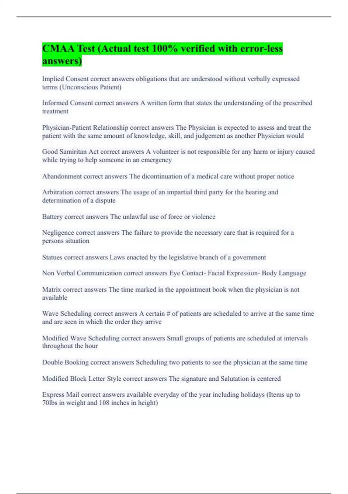Implied Consent correct answers obligations that are understood without verbally expressed terms (Unconscious Patient) Informed Consent correct answers A written form that states the understanding of the prescribed treatment Physician-Patient Relationship correct answers The Physician is expected to assess and treat the patient with the same amount of knowledge, skill, and judgement as another Physician would Good Samiritan Act correct answers A volunteer is not responsible for any harm or injury caused while trying to help someone in an emergency Abandonment correct answers The dicontinuation of a medical care without proper notice Arbitration correct answers The usage of an impartial third party for the hearing and determination of a dispute Battery correct answers The unlawful use of force or violence Negligence correct answers The failure to provide the necessary care that is required for a persons situation Statues correct answers Laws enacted by the legislative branch of a government Non Verbal Communication correct answers Eye Contact- Facial Expression- Body Language Matrix correct answers The time marked in the appointment book when the physician is not available Wave Scheduling correct answers A certain # of patients are scheduled to arrive at the same time and are seen in which the order they arrive Modified Wave Scheduling correct answers Small groups of patients are scheduled at intervals throughout the hour Double Booking correct answers Scheduling two patients to see the physician at the same time Modified Block Letter Style correct answers The signature and Salutation is centered Express Mail correct answers available everyday of the year including holidays (Items up to 70lbs in weight and 108 inches in height)